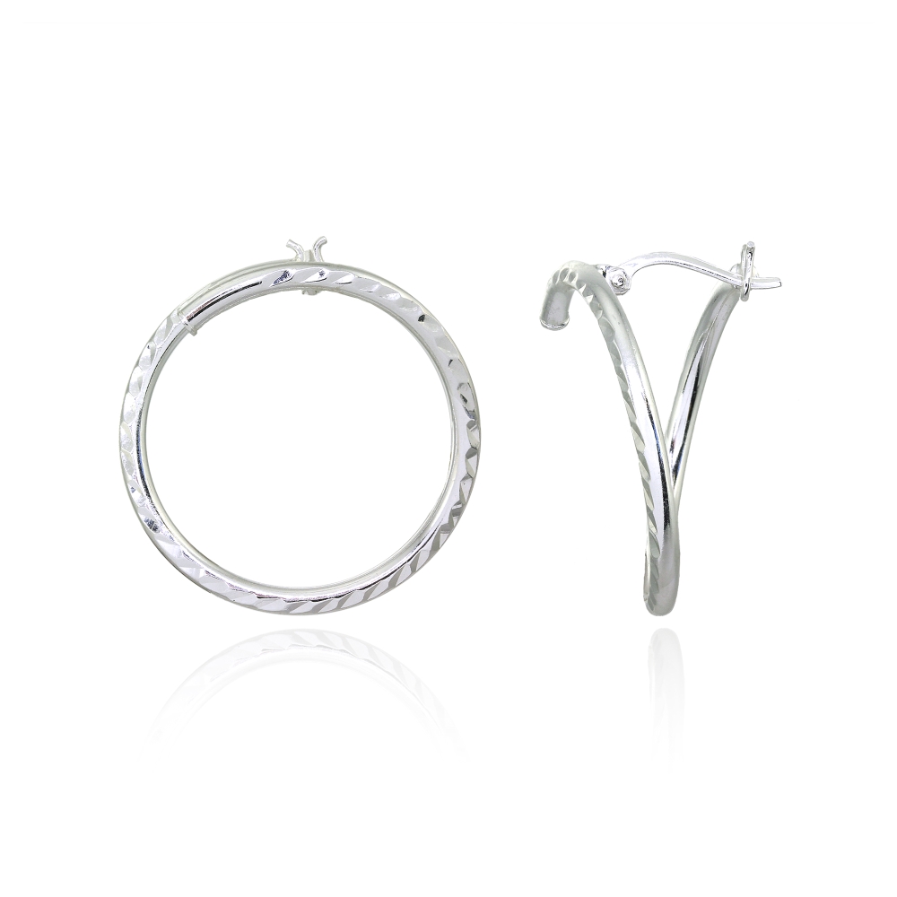 | These earrings are the perfect addition to you sterling silver jewelry and can be purchased as hoop earrings for women and hoop earrings for teen girls. These beautiful earrings for women display diamond-cut round open circles in a unique and trendy front-facing position. They are made of .925 sterling silver and are nickel & tarnish free. The earrings measure 20mm in diameter with 2mm tubing and secure by post with snap-down backs. H16226-20 |
