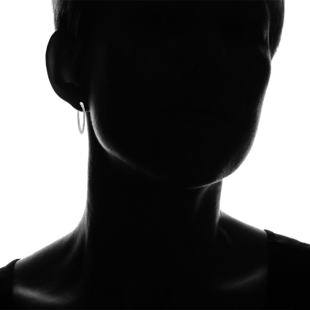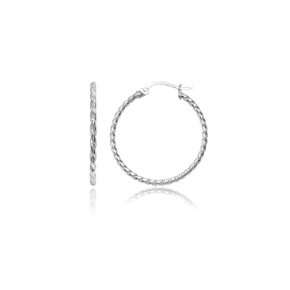 | These stunning hoop earrings are perfect for both simple daytime use and luxurious evening wear. These unique earrings feature polished 1.5mm twist-tube round hoops 30mm in length, creating a fun chic accessory for women and teen girls. These earrings are secured by post with snap-down backs. These hoop earrings are crafted of fine sterling silver and are 100% nickel free. H16616-30 |