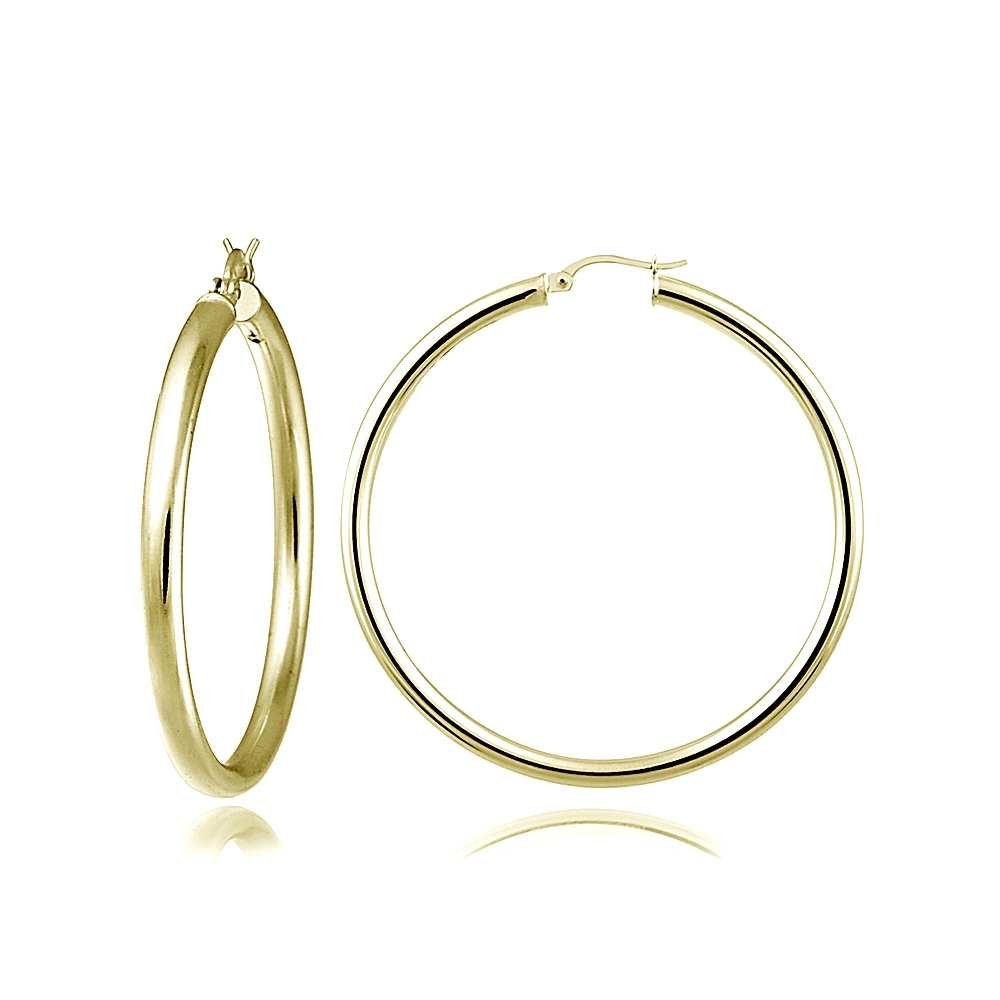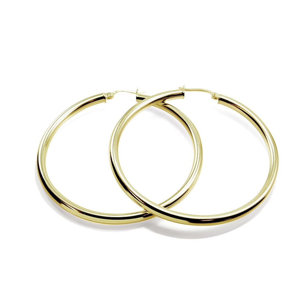 | These earrings feature gold tone over sterling silver high polished round hoops. They are 35mm in diameter. HG14241-35 |