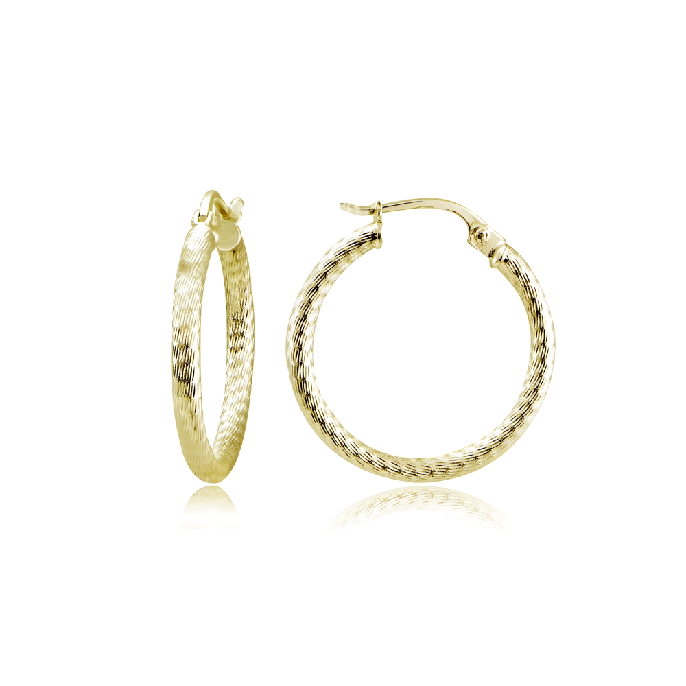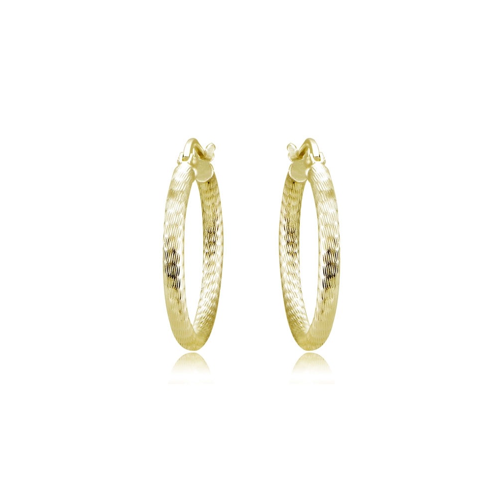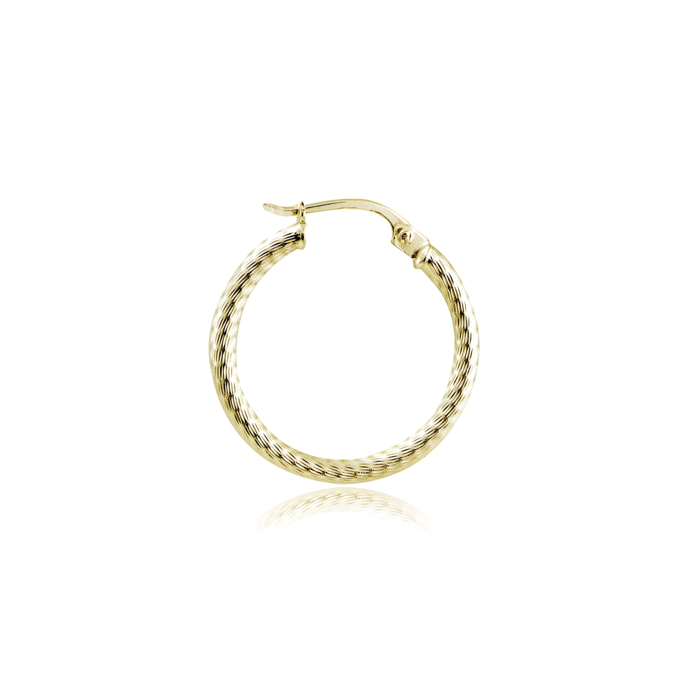 | These earrings are the perfect addition to your sterling silver jewelry and can be purchased as hoop earrings for women and hoop earrings for teen girls. These beautiful earrings display 2mm round-tube hoops in a textured deisgn, for an extra touch. They are made of yellow gold flashed .925 sterling silver and are nickel free. The earrings measure 20mm in diameter with 2mm tubing and secure by post with friction-backs. HG14261 |