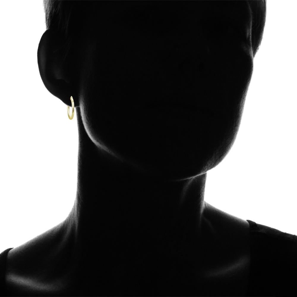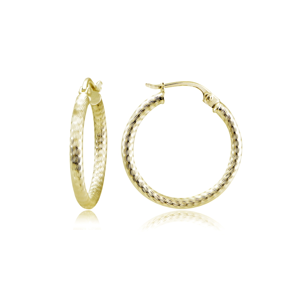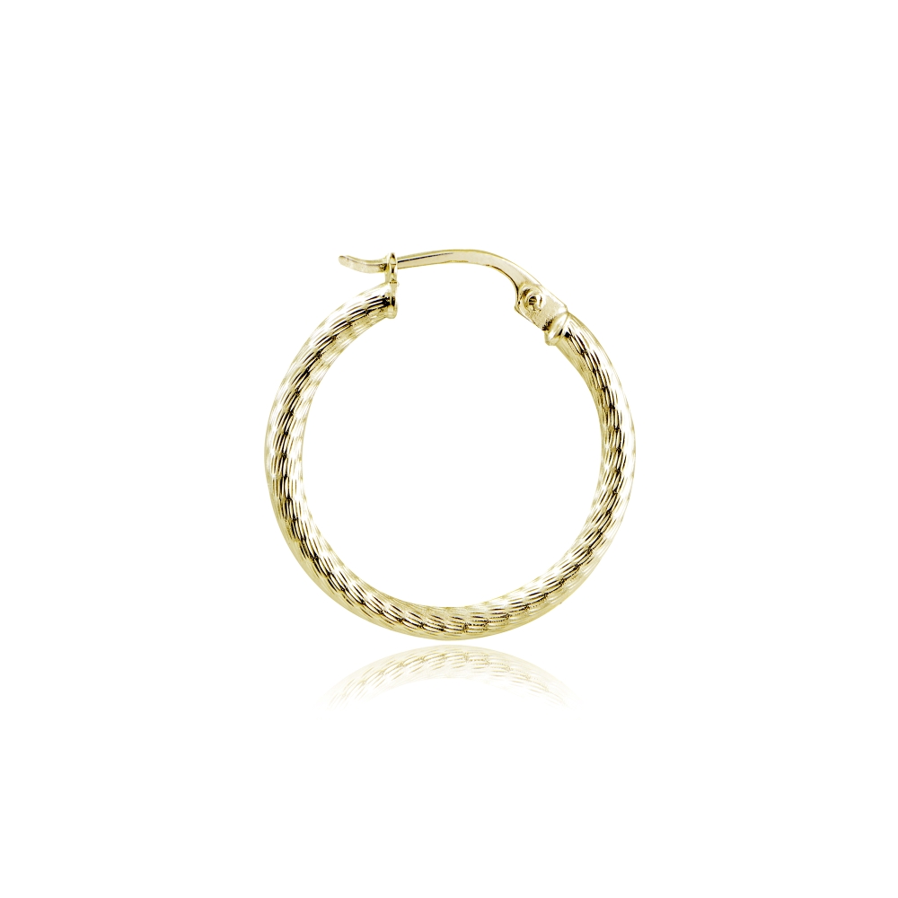 | These earrings are the perfect addition to your sterling silver jewelry and can be purchased as hoop earrings for women and hoop earrings for teen girls. These beautiful earrings display 2mm round-tube hoops in a textured deisgn, for an extra touch. They are made of yellow gold flashed .925 sterling silver and are nickel free. The earrings measure 25mm in diameter with 2mm tubing and secure by post with friction-backs. HG14261-25 |