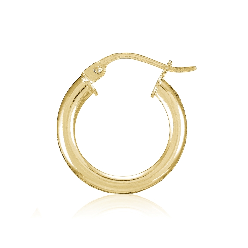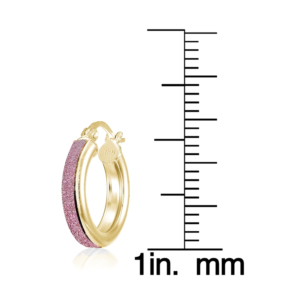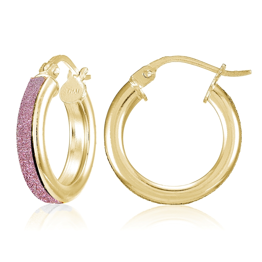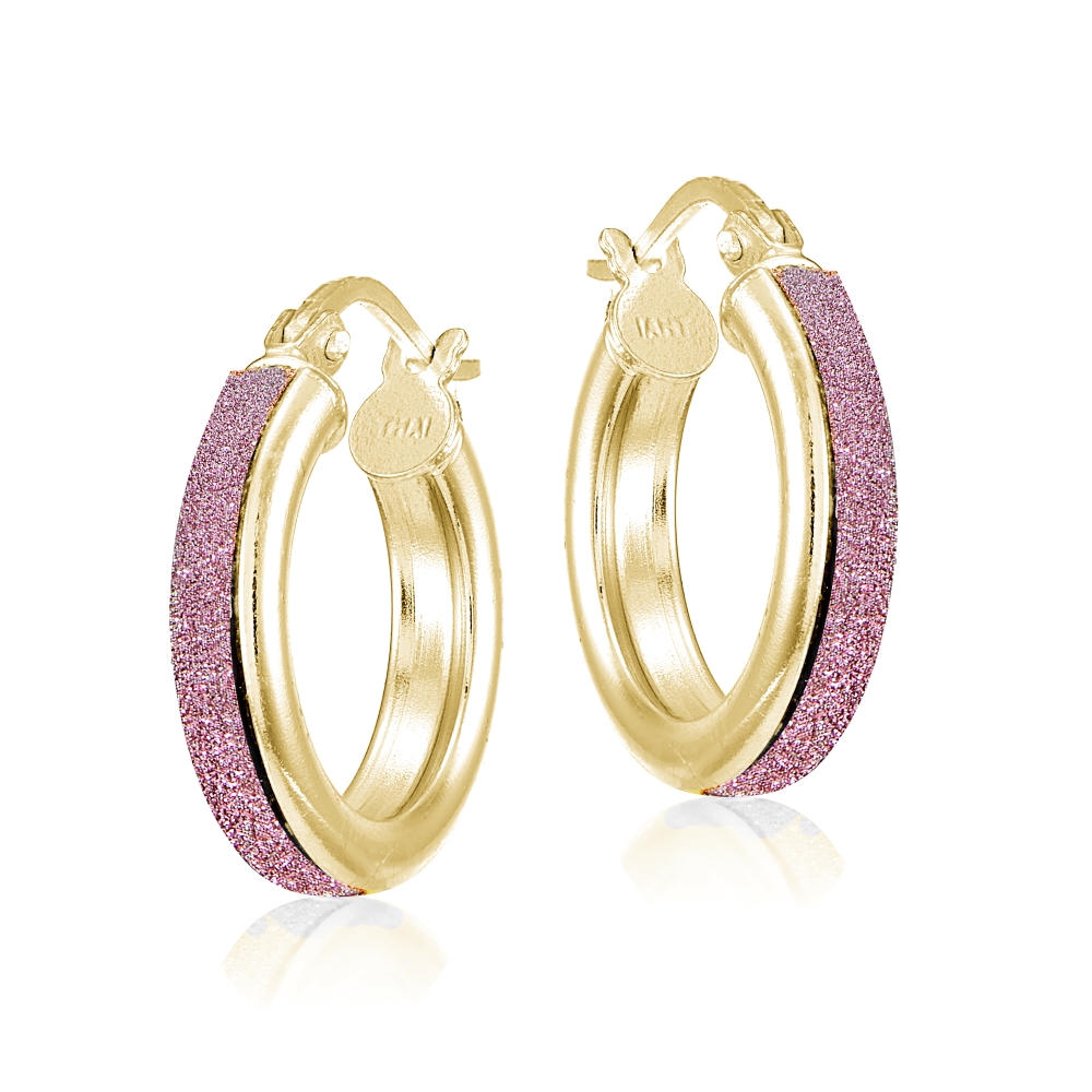 | Add a touch of sparkle with these pink glitter hoop earrings. Created with gold flash sterling silver the earrings are covered in a pink glitter fabric generating a shimmering effect. It secures to the ear with post-with-snap-down backs. HG14974PK-15 |