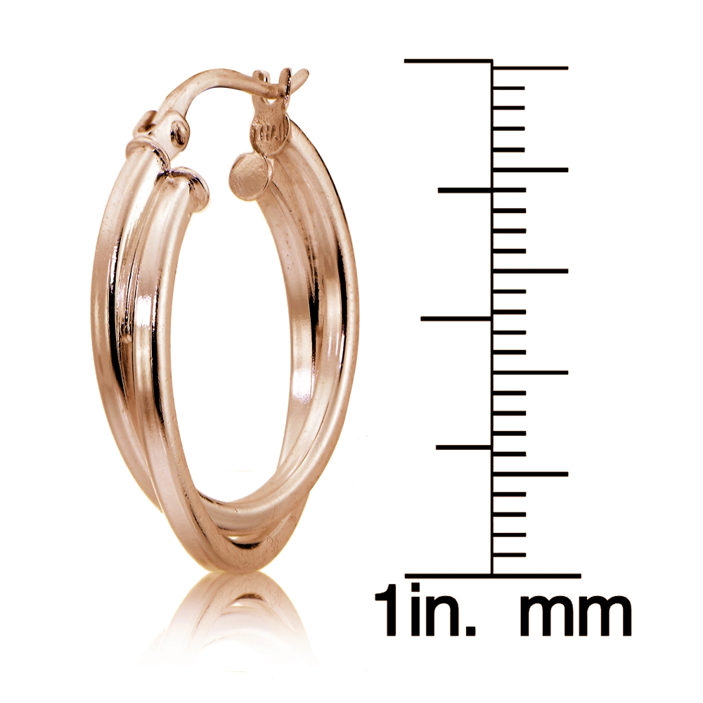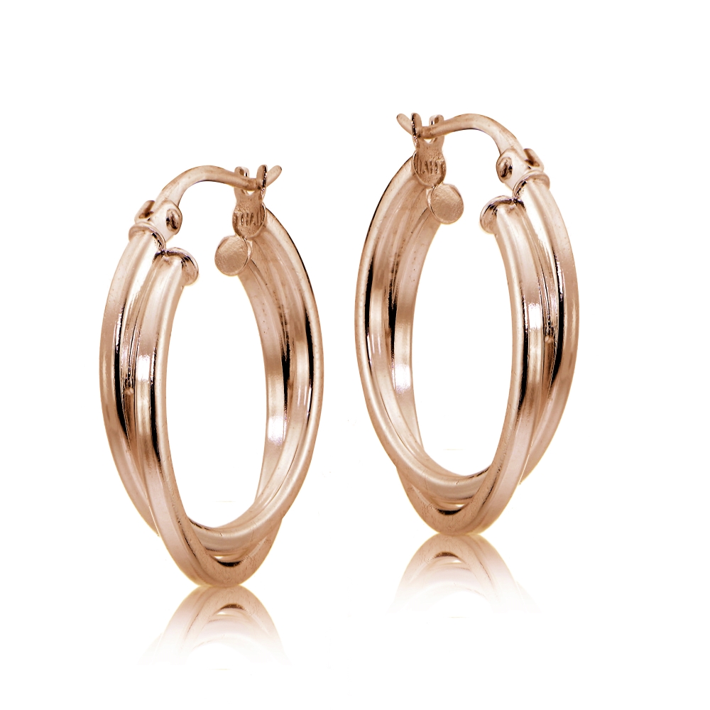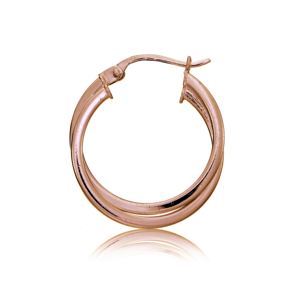 | Let your ears be the focal point with these fabulous hoop earrings. Created of rose gold over sterling silver they feature two square tube intertwining circle hoops. They secure to the ear with post with snap down closures. HRG14890 |