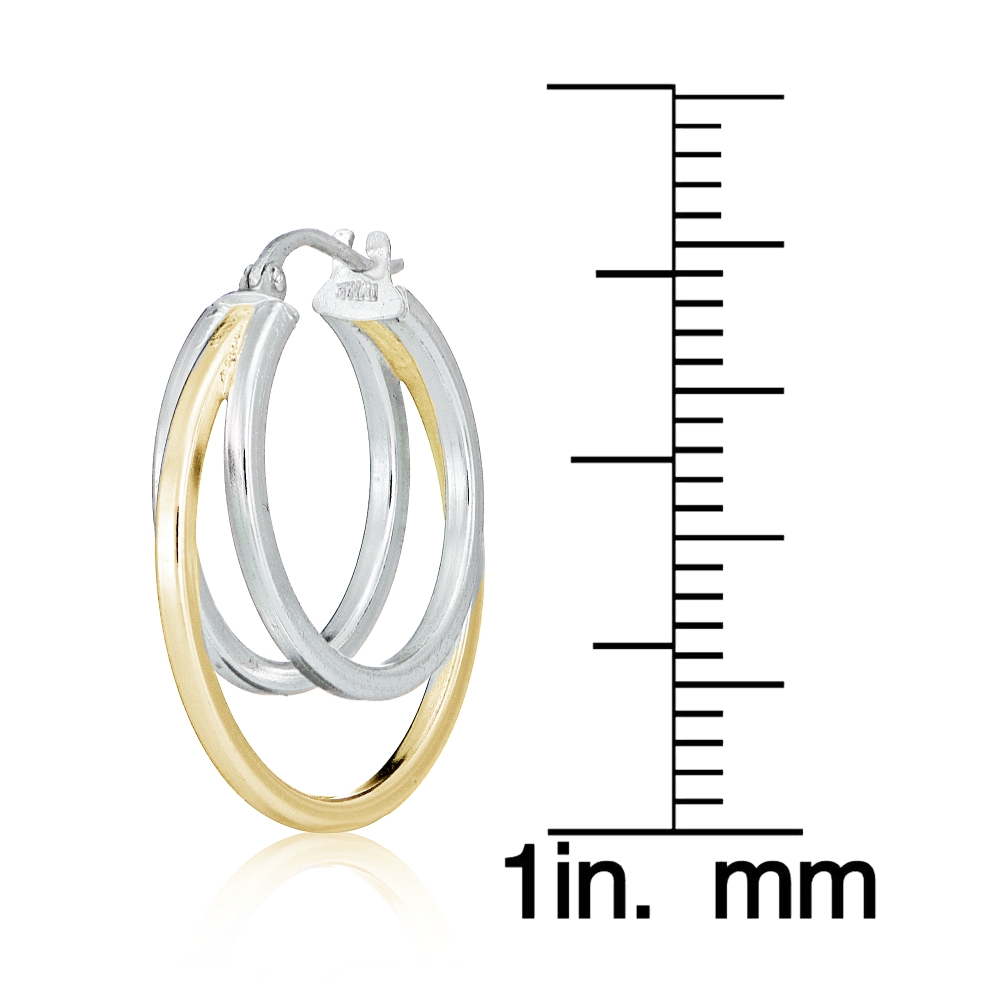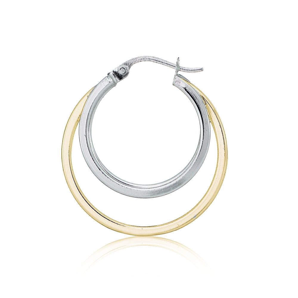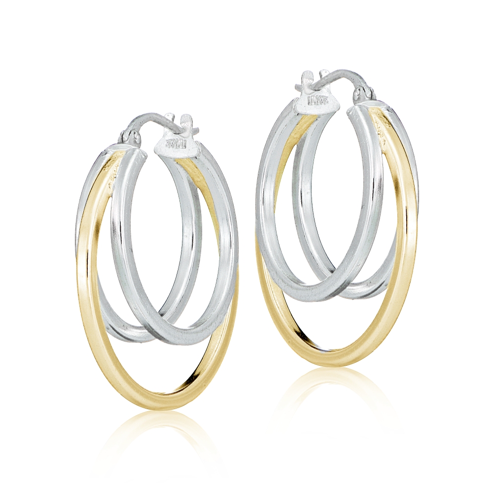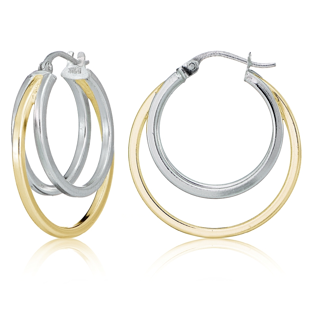 | Let your ears be the focal point with these fabulous hoop earrings. Created of sterling silver two tone they feature a large square tube hoop fused between two small square tube hoops. They secure with post with snap down closures. HT14855 |