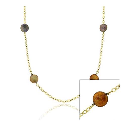 | This beautiful necklace combines classic and trendy. It features an 18K gold plated chain necklace with copper, champagne, and green round coin pearls. It is 30 inches in length. Wear this eye-catching piece for any occasion! NG9759M27 |