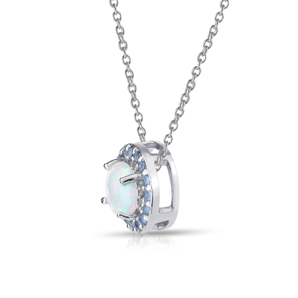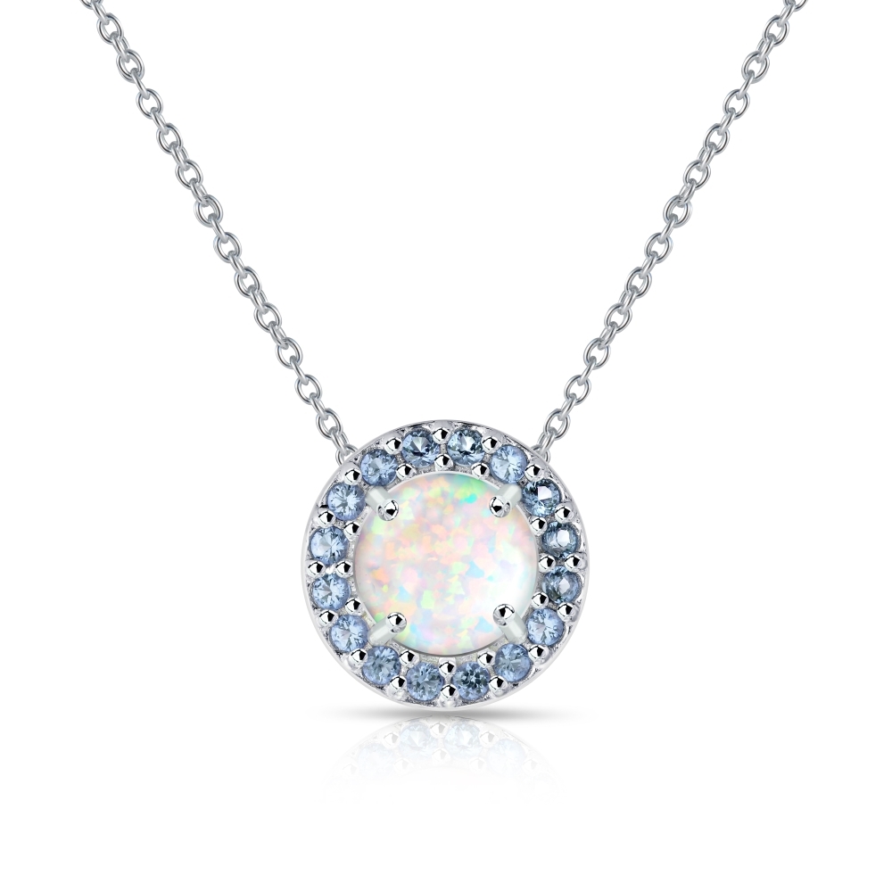 | This luxurious round halo necklace features a simulated opal gemstone surrounded by gemstones of simulated tanzanite linked to an 18 inch rolo chain. This necklace is crafted of fine sterling silver and fastens with a classic spring ring clasp. P14494MN7 |