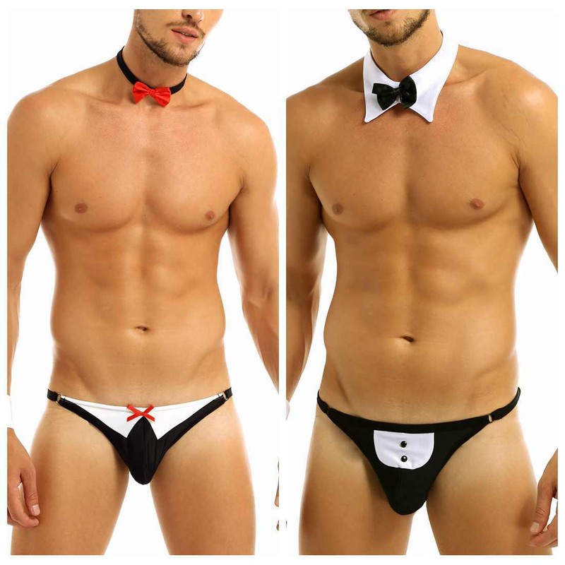 Novelty waiter tuxedo lingerie suit for men costume, includes a G-string thong, one pair bracelets and a neck piece.