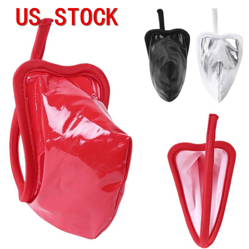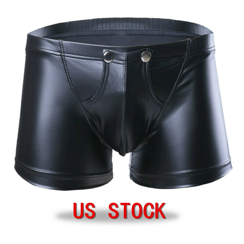 Underwear features low rise with elastic waistband, front zipper and T-back, patent leather patchwork design.