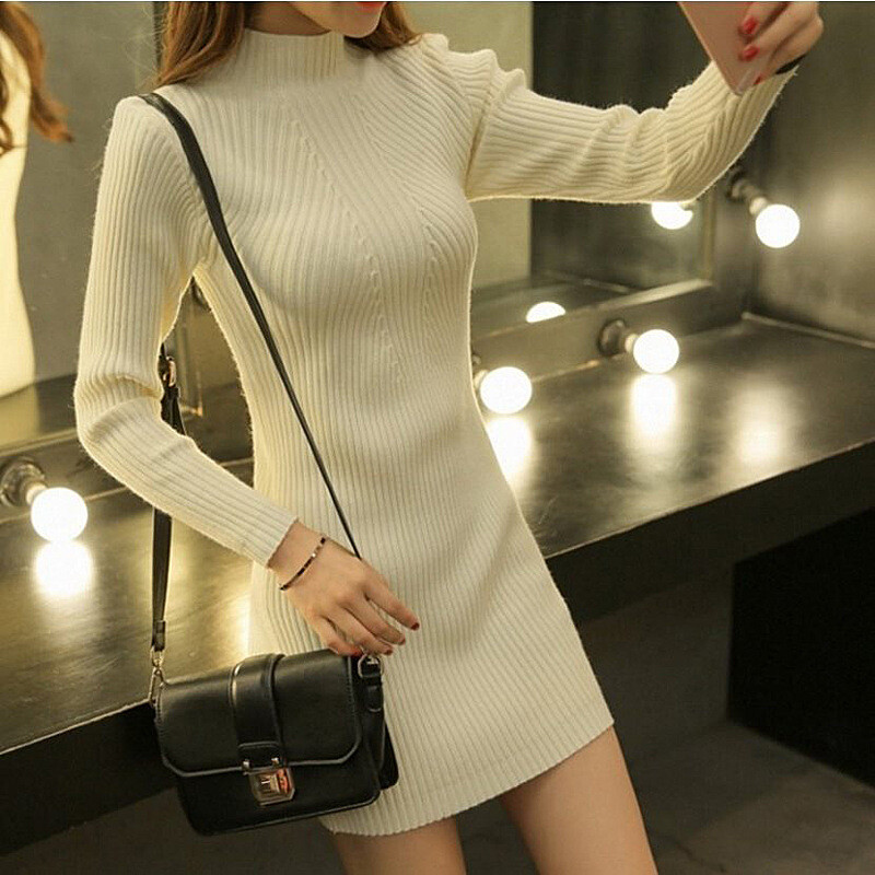 Women Casual Solid Color Slim Sweater Dress Long Sleeve Pullover Knitted Dresses