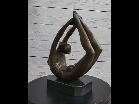 This bronze sculpture portrays a talented gymnast demonstrating her exceptional agility and flexibility. Balancing on her stomach, she elegantly holds her feet with her hands, showcasing the strength and grace of her athletic body. Her muscular legs curve backward, resting in her hands on her shoulders, highlighting her athletic prowess and dedication to her craft.
