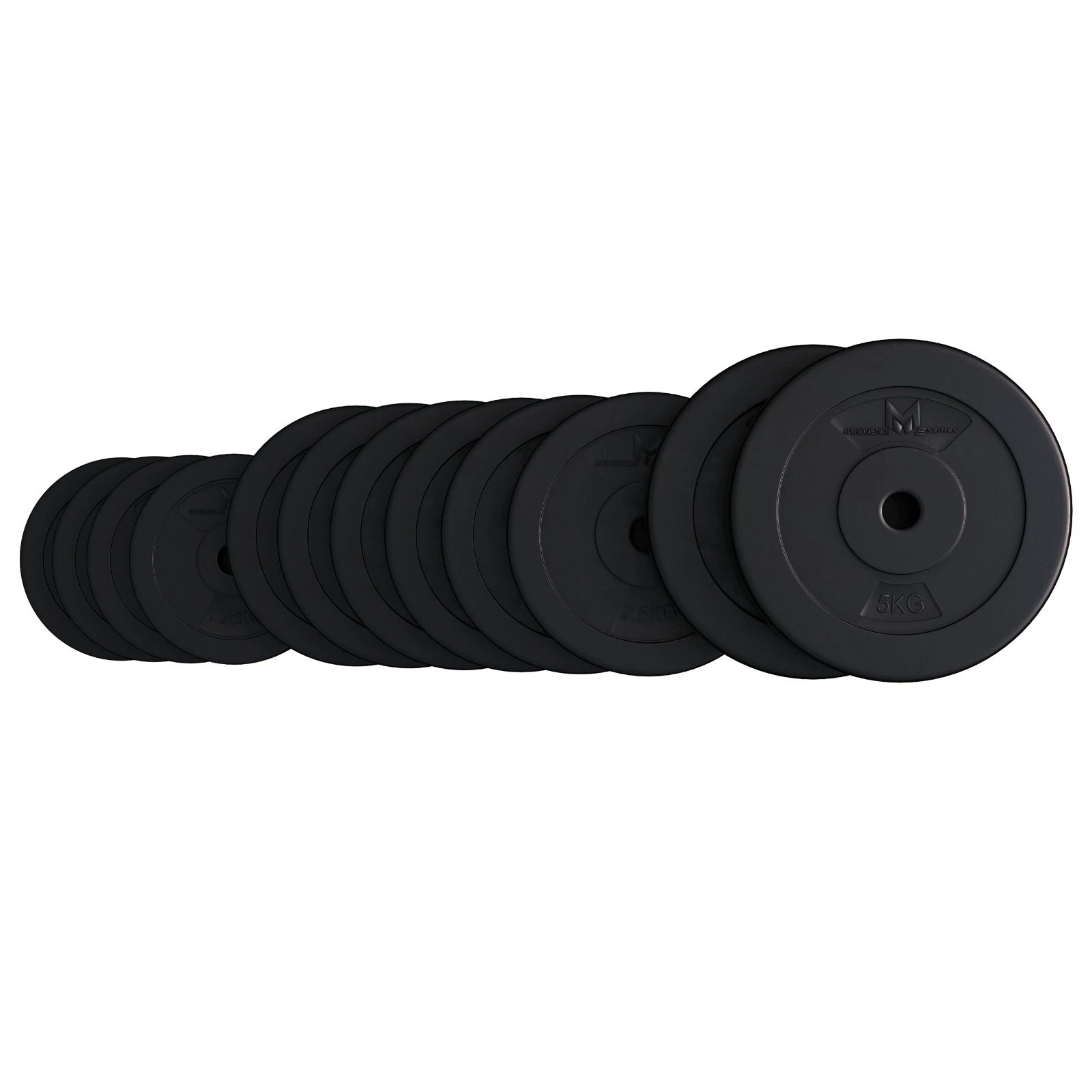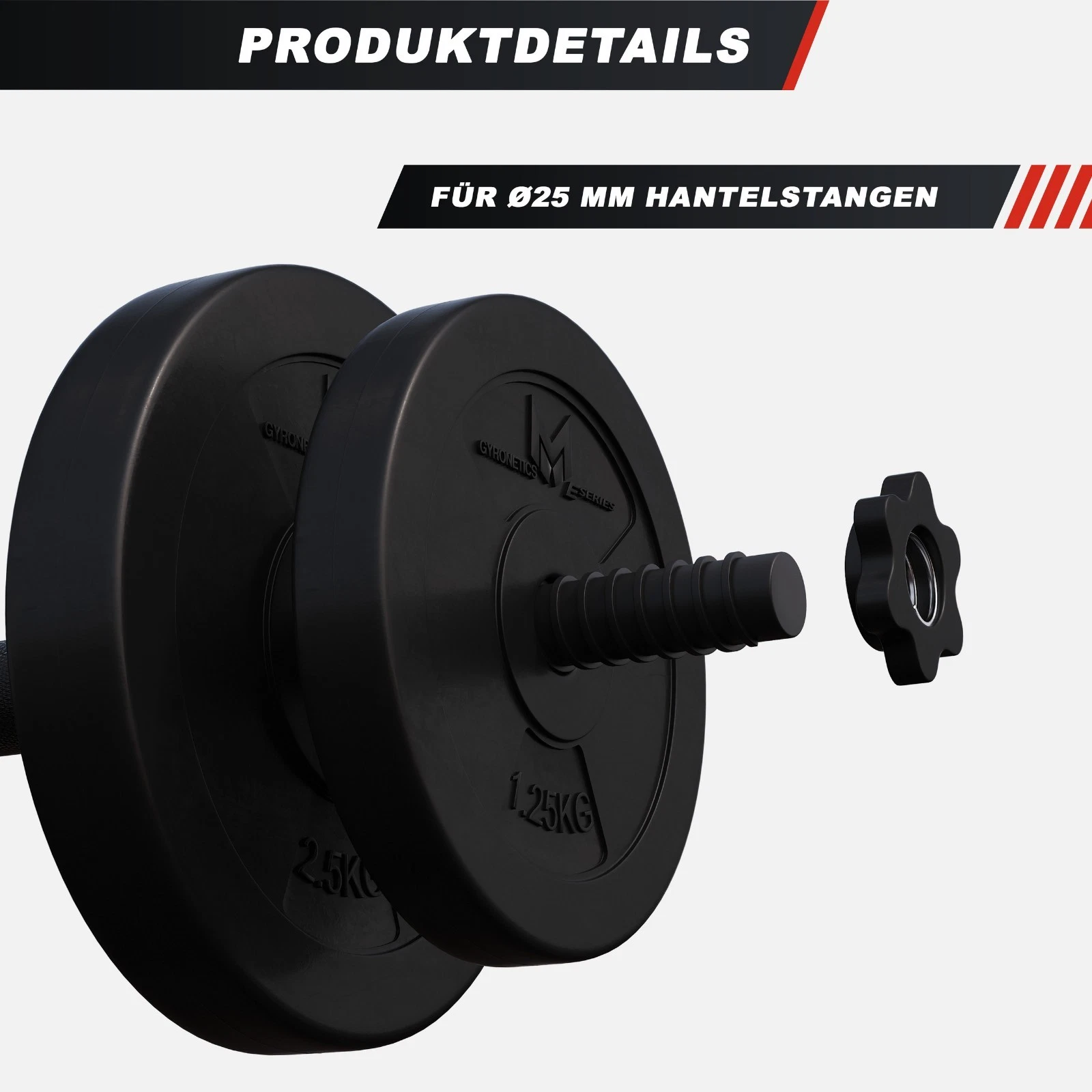 Der Hersteller Gyronetics steht für Qualität und Sicherheit. Die Kunststoffverschalung der Scheiben sorgt dafür, dass die meisten Böden beim Absetzen der Hanteln von Kratzern verschont bleiben. Ganz gleich, ob Du Dich langsam herantasten oder gleich richtig schwer durchstarten willst - das Set aus zwei Scheiben à 5 kg, sechs Scheiben à 2,5 kg und vier Scheiben à 1,25 kg mit jeweils einem Lochdurchmesser von 25 mm ermöglichen ein individuelles Training nach Deinem aktuellen Stand und Deinen Zielen.