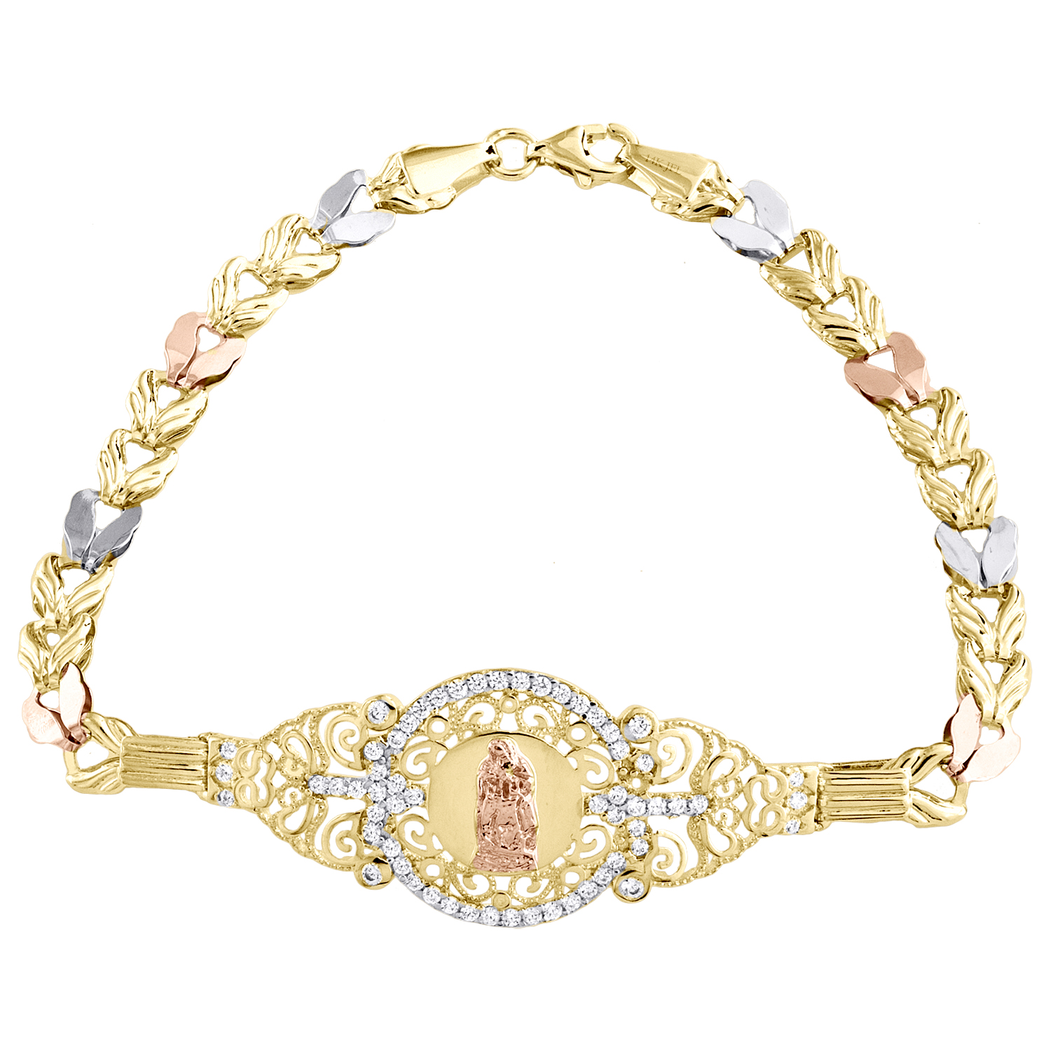 (6.2 gr. of 14K Tri-Color Gold | Length: 7.50" | ID Width: 17mm | Link Width: 5mm | Italian Handmade Statement Religious Mother Mary ID Fancy Bracelet)
