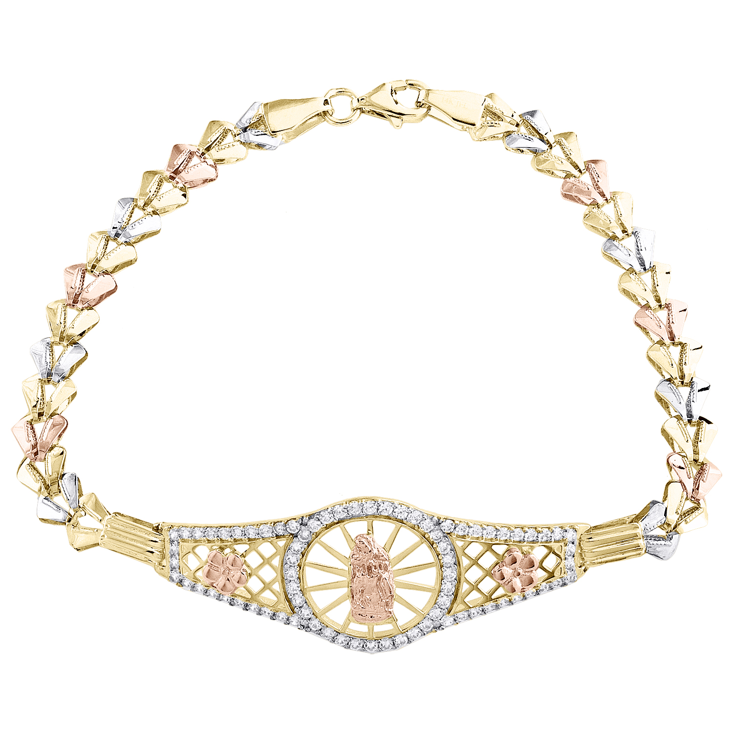 (5.4 gr. of 14K Tri-Color Gold | Length: 7.25" | ID Width: 15mm | Link Width: 5mm | Italian Handmade Statement Religious Mother Mary ID Fancy Bracelet)
