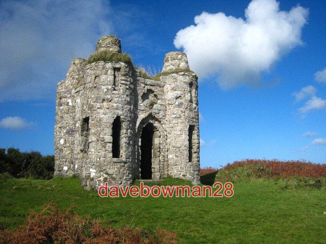 PHOTO ROGERS TOWER A FOLLY PROBABLY USED AS LOOK-OUT TOWER IN THE FORM OF A MINIATURE CASTLE SET PROMINENTLY ON THE HILL OF CASTLE-AN-DINAS SO THAT THE BUILDING GIVES THE IMPRESSION THAT IT AND THE HILL ARE MUCH LARGER THAN THEY REALLY ARE. PROBABLY ASSOCIATED WITH JOHN ROGERS OF TREASSOWE 1750-1832. GRADE II LISTED IT PROVIDED ME WITH WELCOME SHELTER FROM A SUDDEN RAIN SHOWER WHEN NO OTHER COVER EXISTS FOR A VERY GREAT DISTANCE! 2010 COPYRIGHT (Photograph and text in Extra Info) ROD ALLDAYPHOTO PAPER THICKNESS NORMAL PHOTOGRAPH THICKNESS