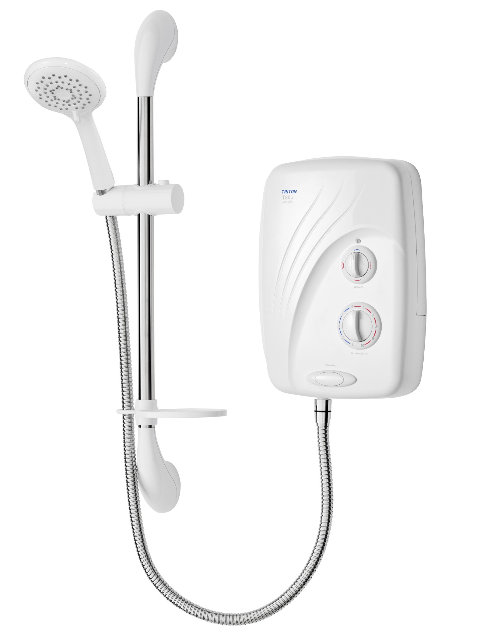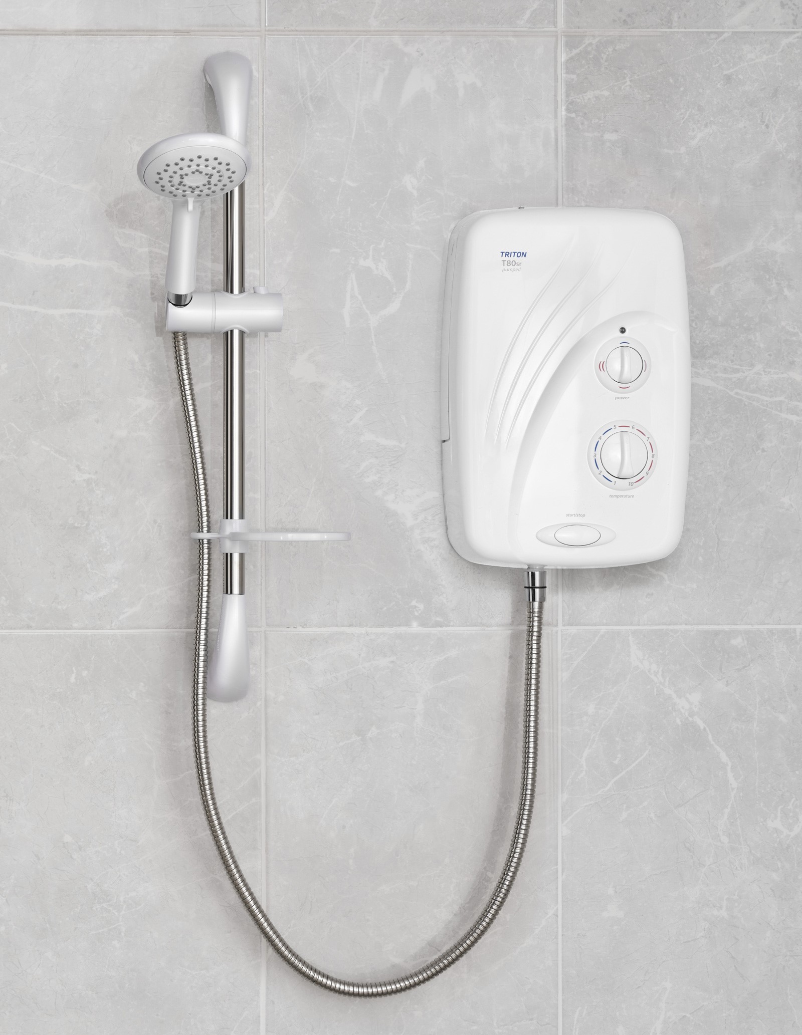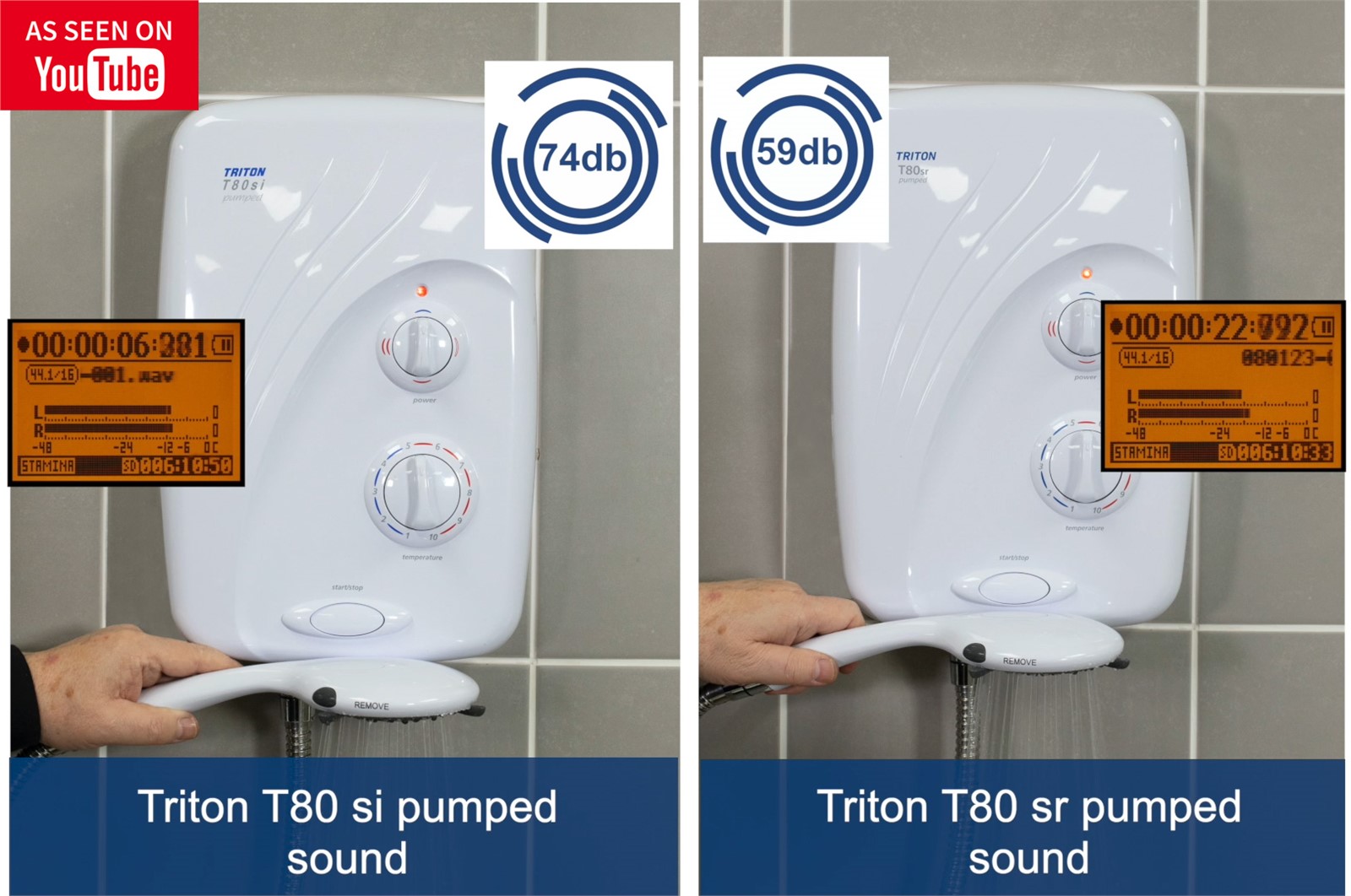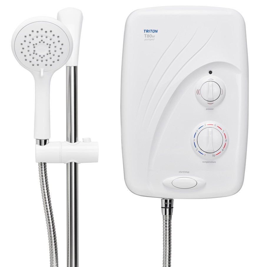 Styled on the best selling T80si; the Triton T80SR silent running pumped electric shower is a tank-fed integral pumped electric shower designed for installations where the pressure of the mains water supply is too low, unreliable or non-existent, with push START/STOP button and 'Power On' indicator.