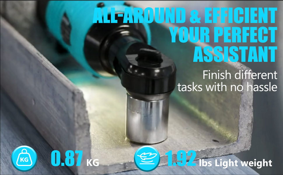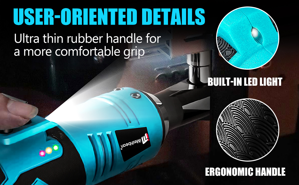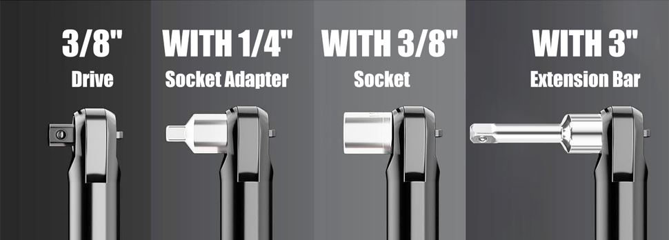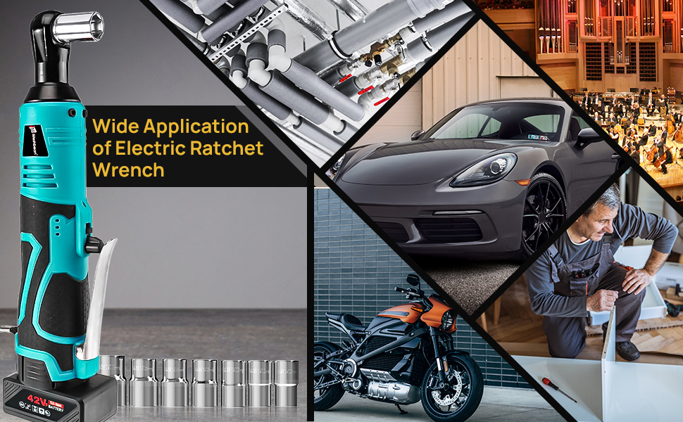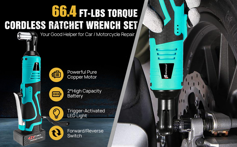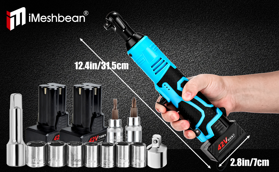 | Package: 1 x Right Angle Wrench Ratchet, 2 x 42 V 3000Ah Lithium Ion Batteries, 1 x Fast Charger, 7 x Sockets--10mm, 11mm, 12mm, 13mm, 14mm, 15mm, 17mm; 1 x 3-in Extension bar, 1 x 1/4" Head Adapter, 2 x Screwdriver bits, 1 x Carrying Bag |