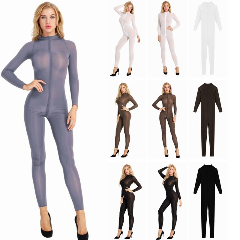 Sleeveless, deep u neck and back with a zipper in the front, see through sheer mesh design, high cut legs.