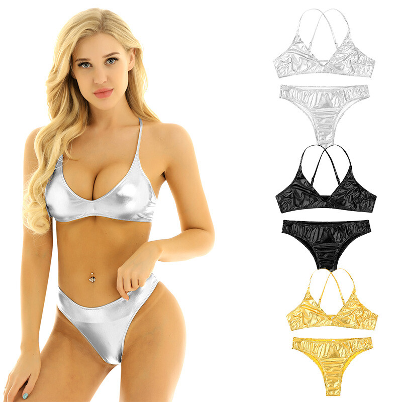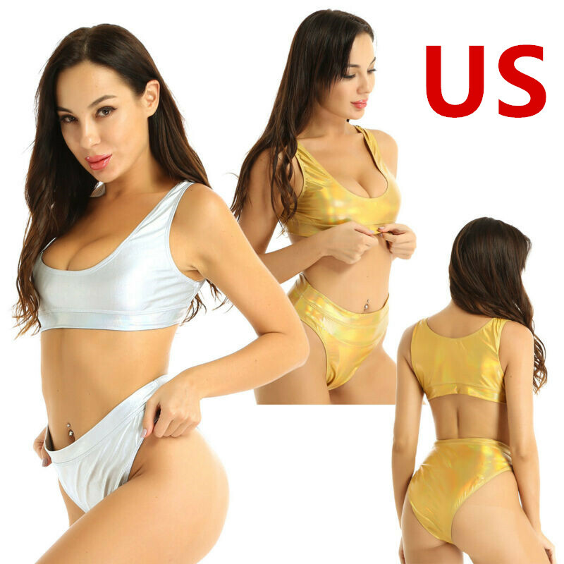 2pcs Women Shiny Metallic Bikini Swimsuit Set Bathing Suit Beachwear Underwear