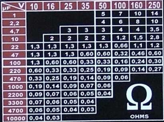 ESR Capacitor-Resistor Reference Table:
