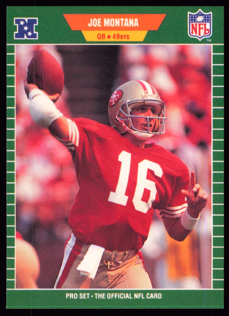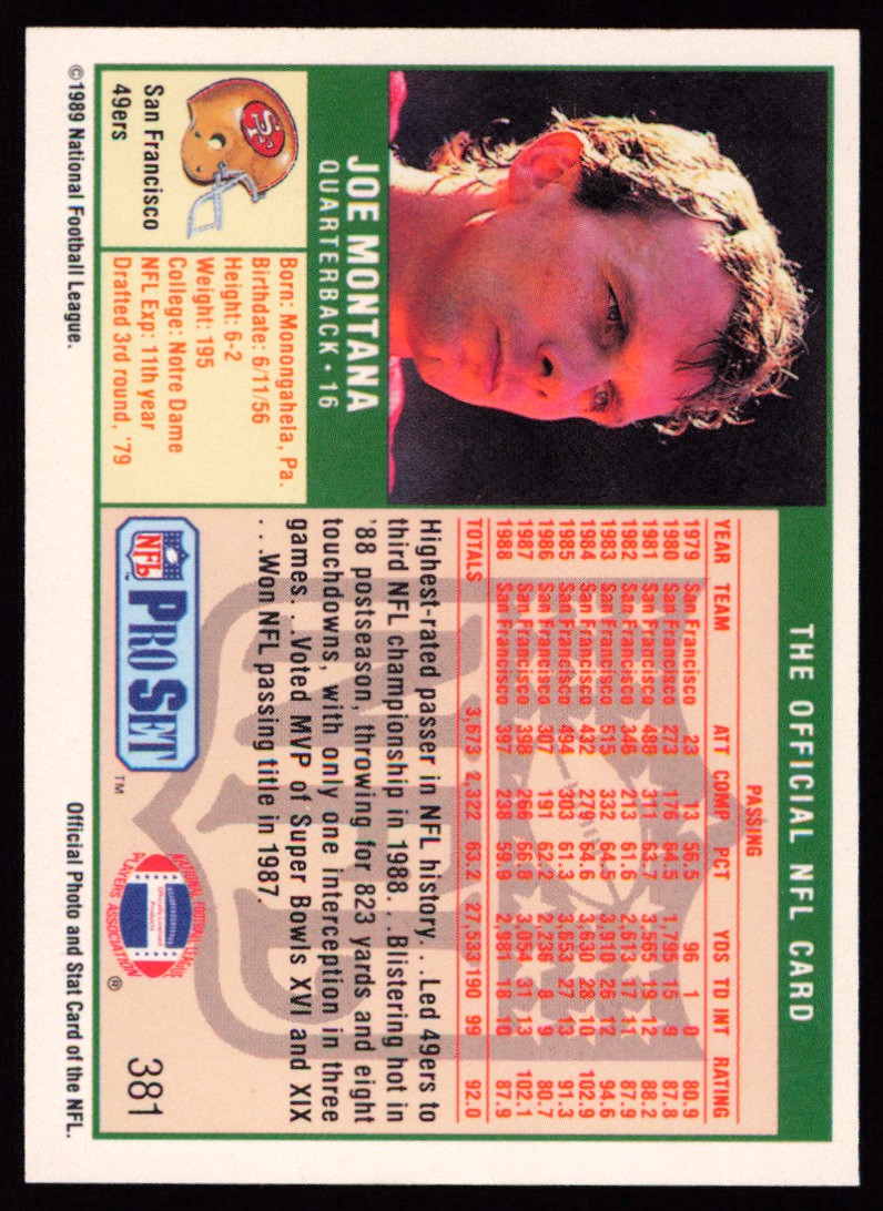| Description: | Joe Montana | | Category: | Football | | Year: | 1989 | | Product: | Pro Set | | Team: | San Francisco 49ers | | Card Number: | 381 | | Dimensions: | 3½" x 2½" |
