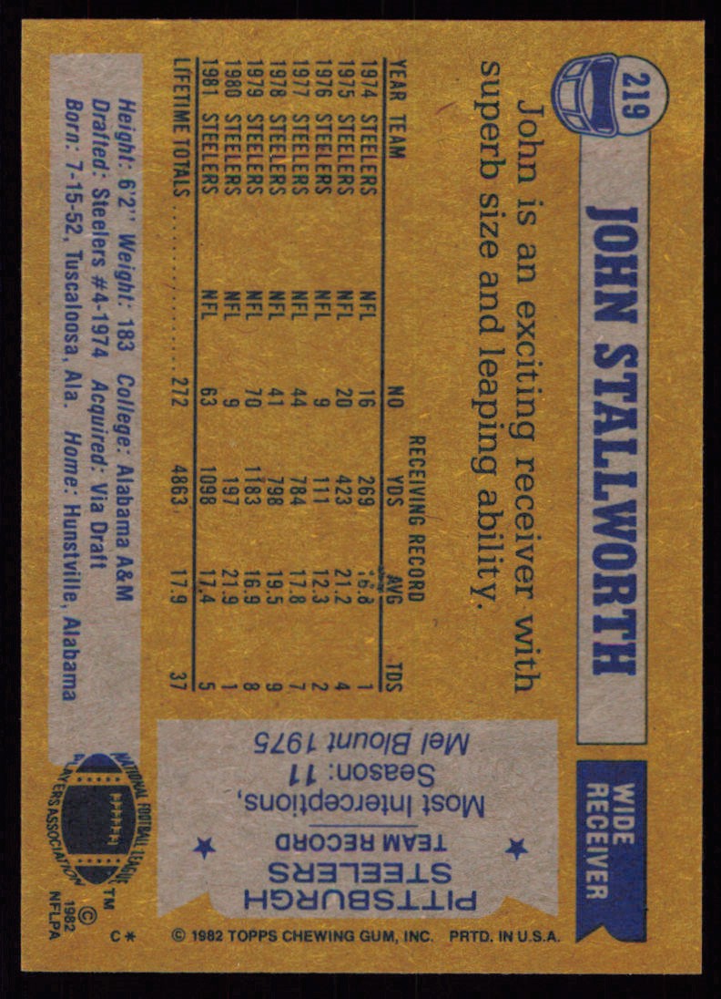| Description: | John Stallworth | | Category: | Football | | Year: | 1982 | | Product: | Topps | | Team: | Pittsburgh Steelers | | Card Number: | 219 | | Dimensions: | 3½" x 2½" |
