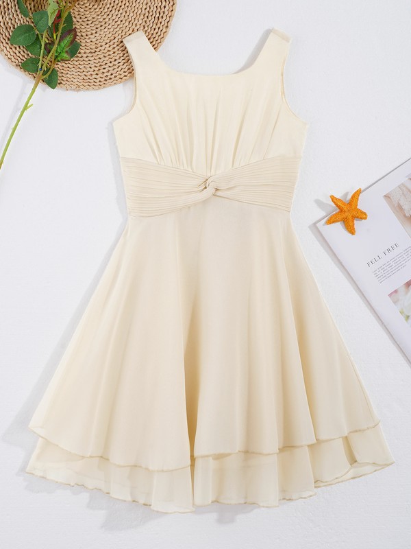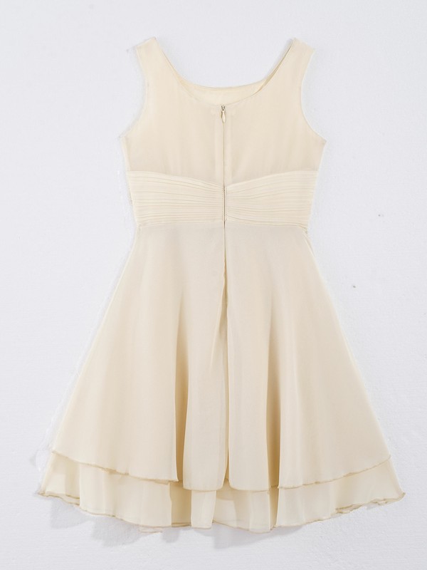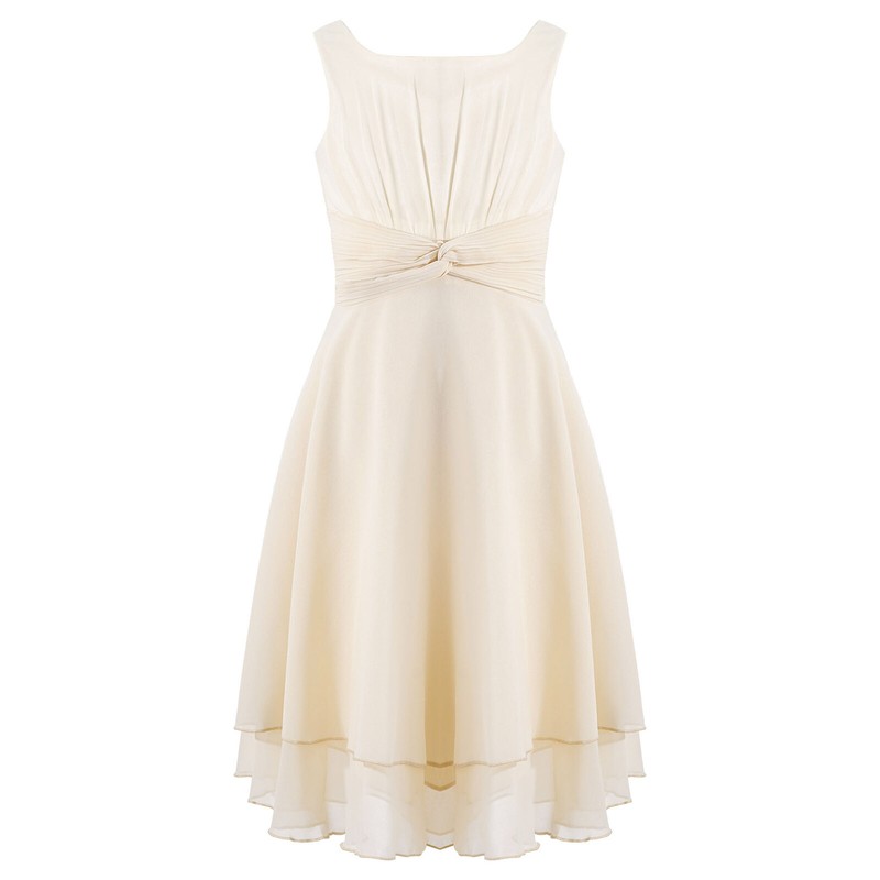Sleeveless and round neckline, pleated top bodice and ruched at waist.