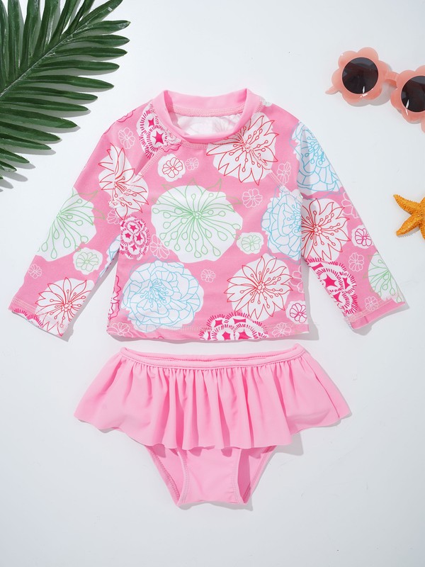 Children Pink Rashguard Set Bathing Suit Skirt Bottom Scoop Neck Shirt.