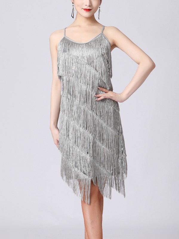 Womens Shiny Sequins Fringed Dress Samba Tango Latin Dance Costume Adjustable Spaghetti Straps Tassel Dresses.