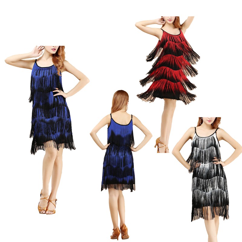 Women Shiny Sequins Fringed Dress Samba Tango Latin Dance Costume Tassel Dresses