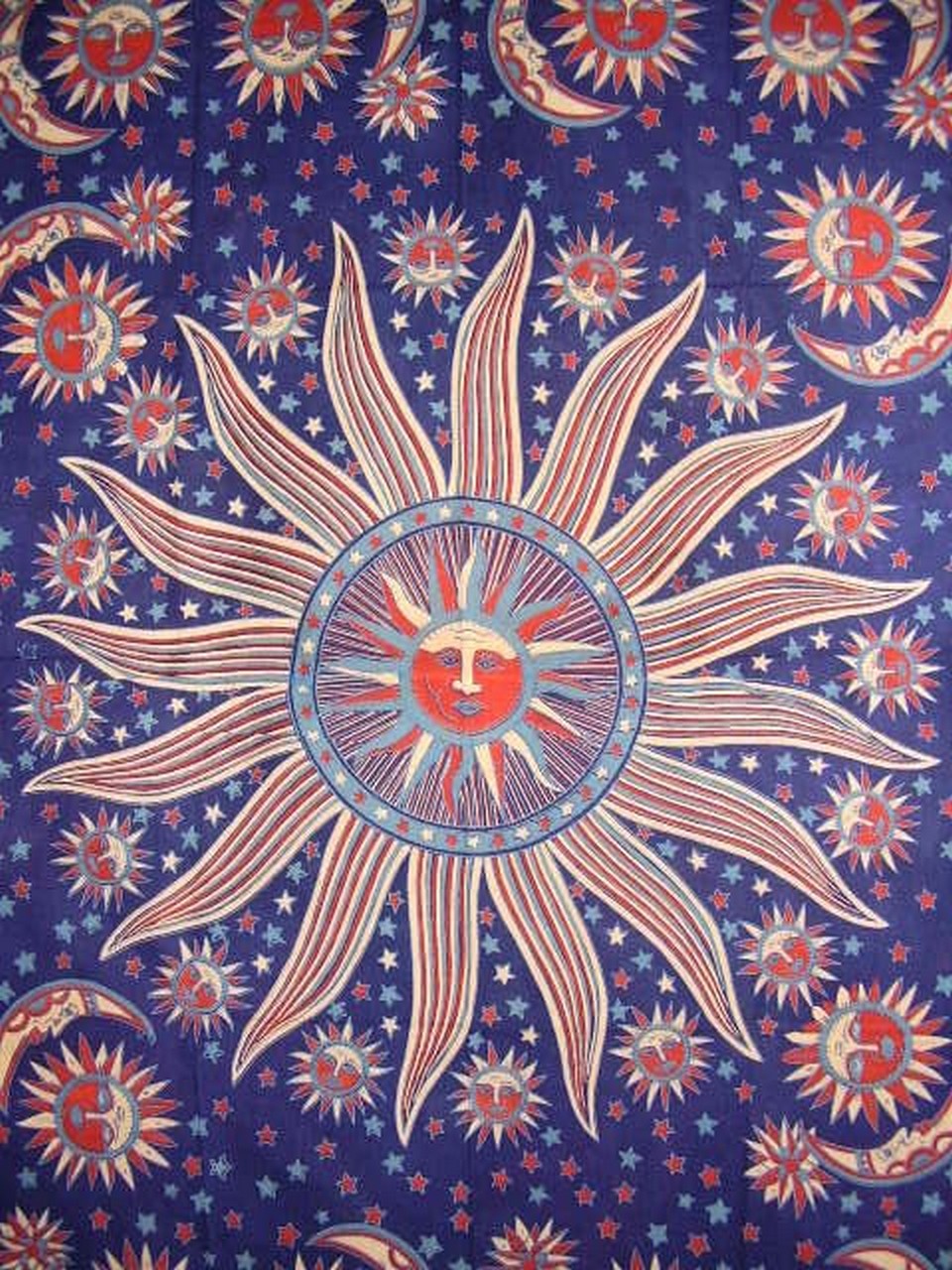 CELESTIAL TAPESTRY ~ Lovely celestial tapestry in navy blue with red, tan and light blue accenting colors. Made of 100% power-loomed cotton offering a strong, tight, durable weave. Measures approximately 7 feet x 9 feet. They can be machine washed separately on cool/gentle and tumble dried. If your into the cosmos, this is the tapestry for you. Sun, moon and stars adorn. A lovely quality with endless versatility. Your Celestial tapestry can be used for: