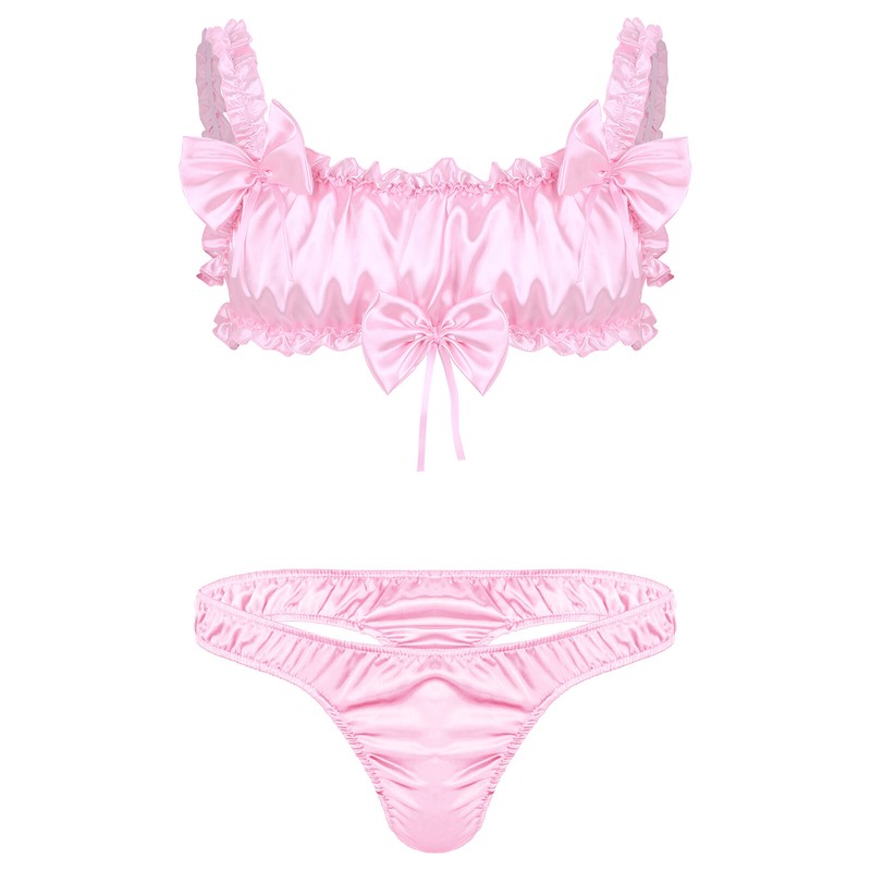 Mens Sissy Underwear nightwear Satin Ruffled Bra Top with Garters Satin Frilly Briefs.