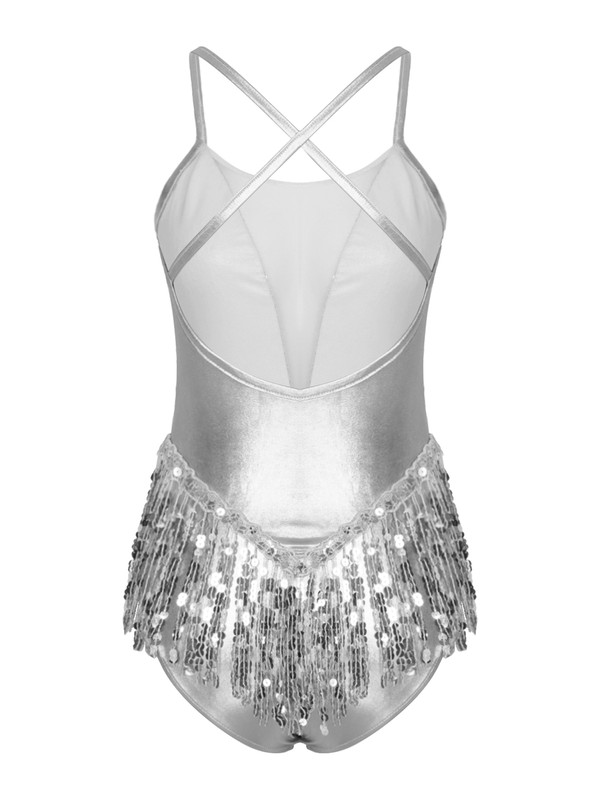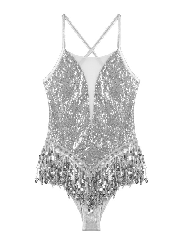 Womens Sparkling Sequins Fringed Leotard Cross Back Bodysuit Dancewear.