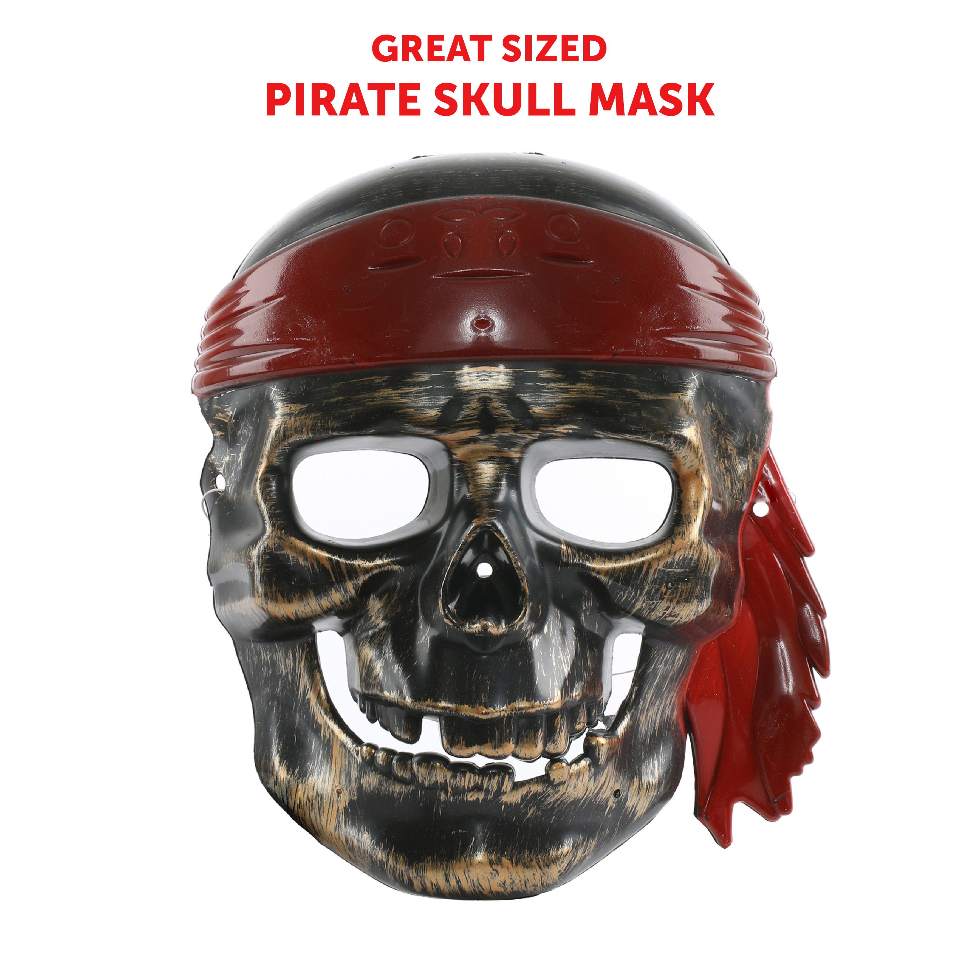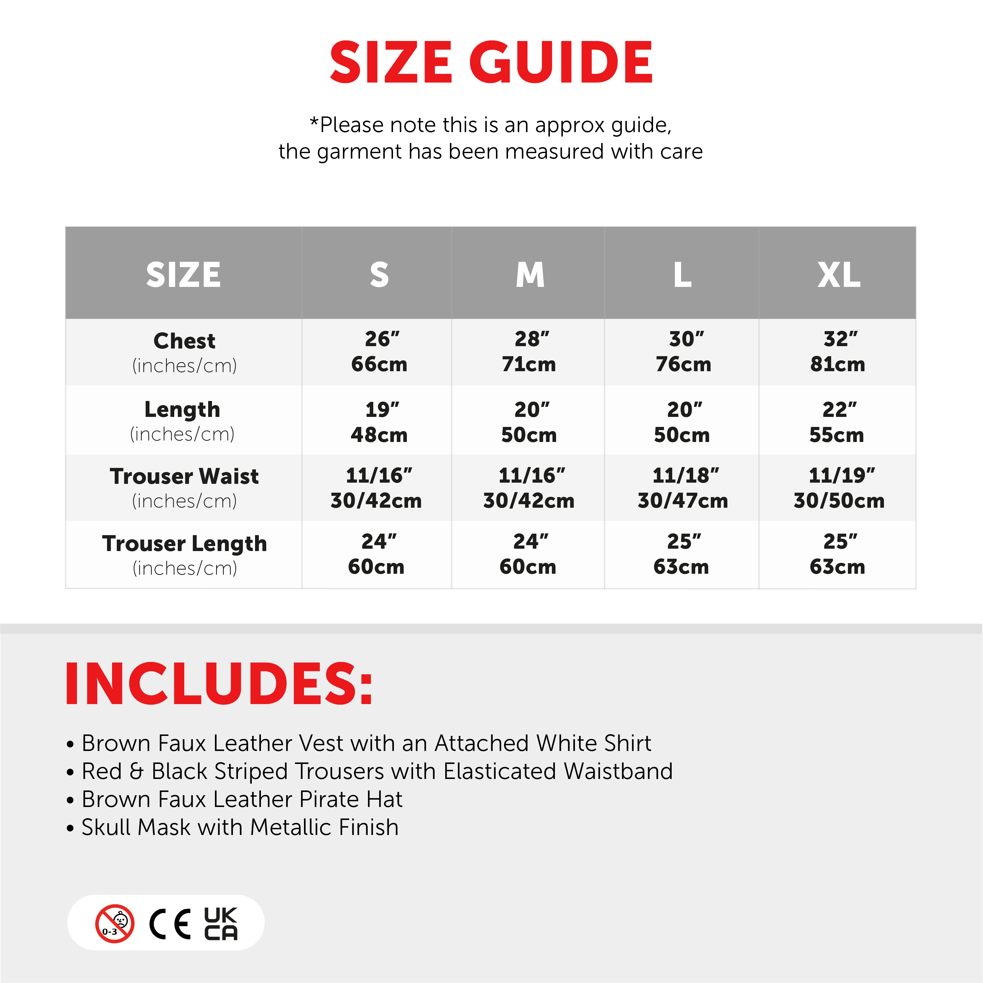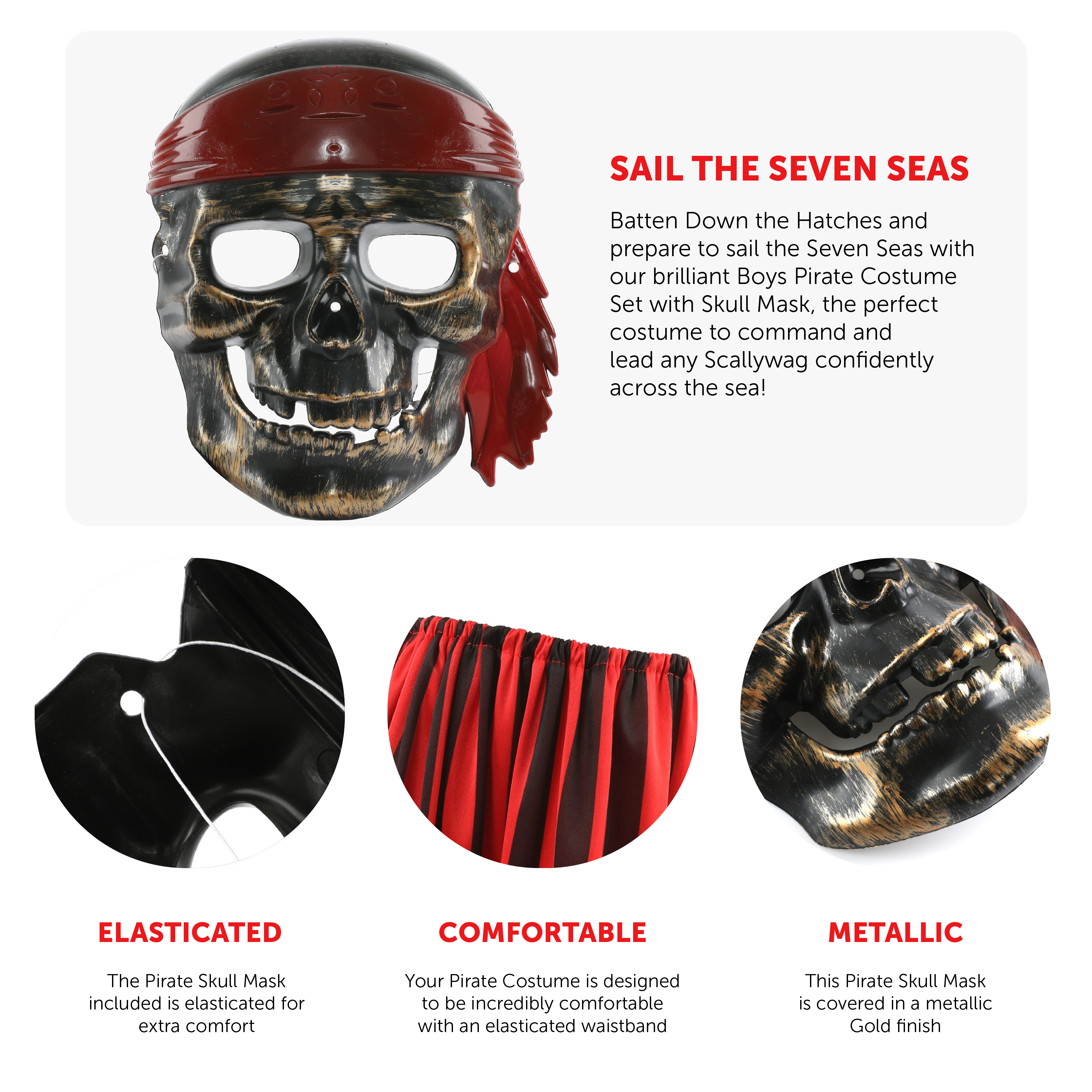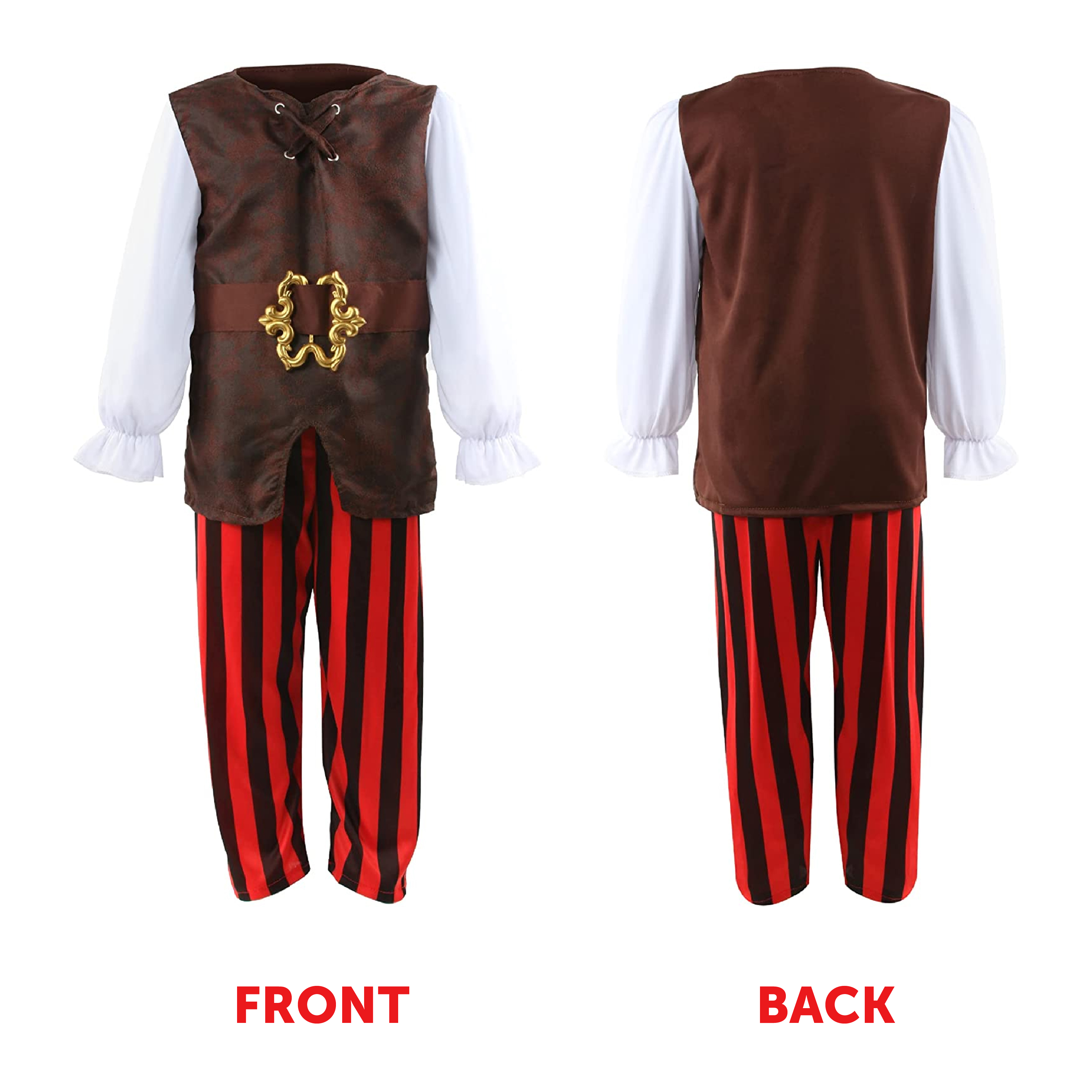 COSTUME INCLUDES: Your Boys Pirate Fancy Dress Costume includes a Brown Leather-Look vest with an Attached White Shirt, Red and Black Striped Trousers, and a Brown Leather-Look Pirate Hat with a Red Band and Skeleton Mask!