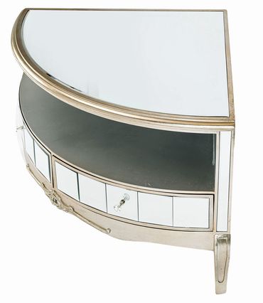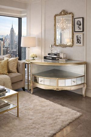 L'écurie Le cadre en bois est entièrement recouvert de verre miroir de haute qualité, qui permet au meuble de refléter la lumière avec élégance et de donner à votre salon une atmosphère lumineuse et glamour. Le style est basé sur ce qui est populaire Régence hollywoodienne et design glamour, connu pour ses luxueux meubles en miroir.