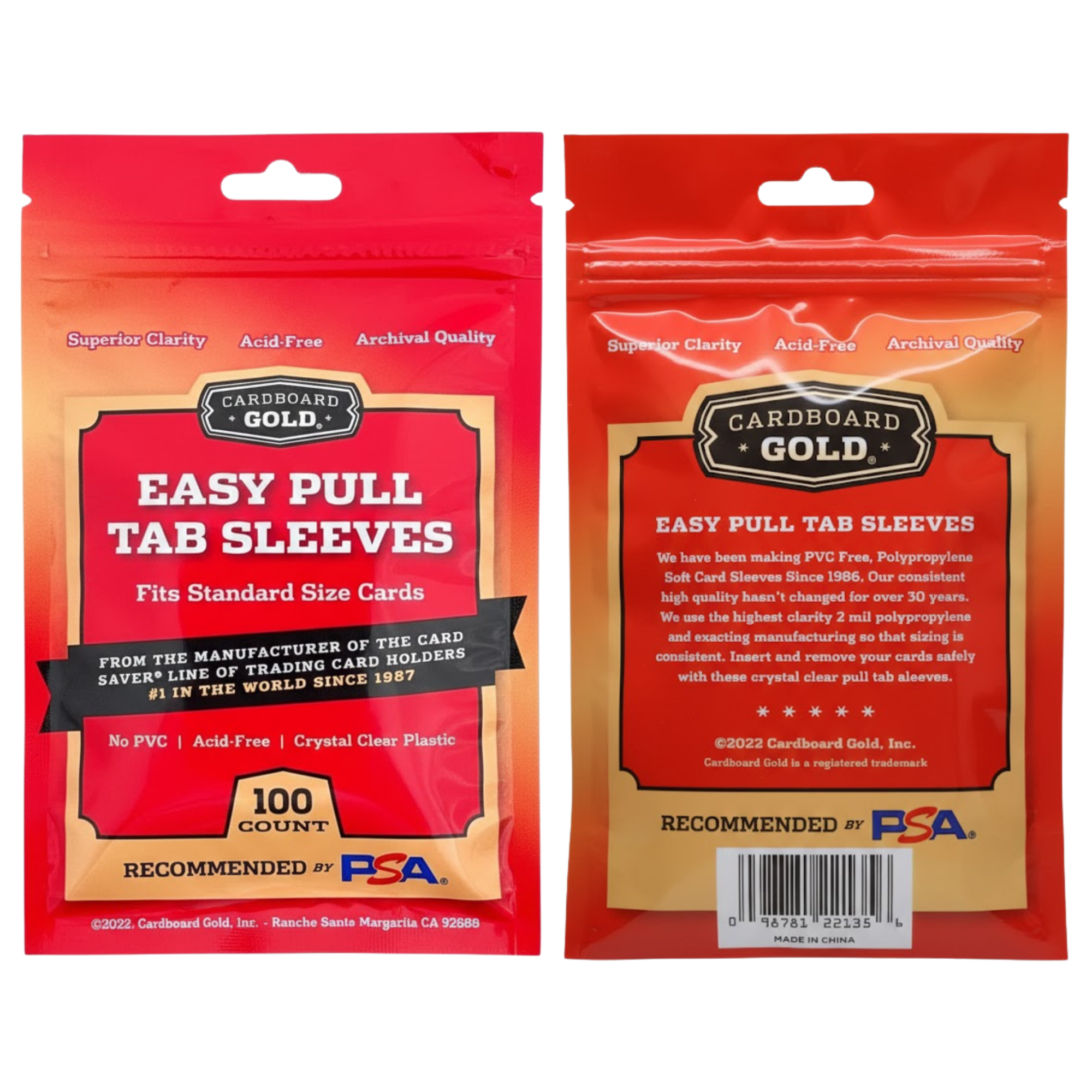 Archival-grade, acid-free and non-PVC card sleeves designed to hold standard 2-1/2" X 3-1/2" cards. The sleeve has an tab on the back material to assist with insertion of cards and prevent card corner damage. Tab is also designed to be able to easily grip it and remove a card and sleeve from a Toploader. 100 count per pack.