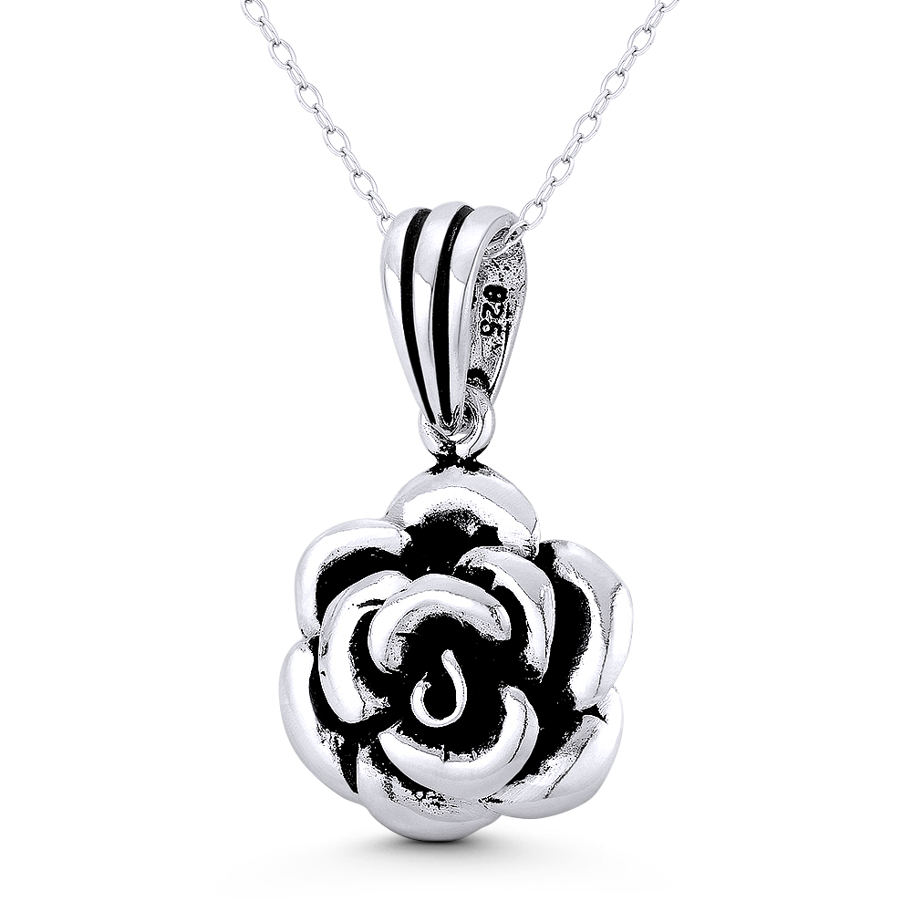 The featured pendant is cast in oxidized-finish .925 sterling silver and showcases a 34x18mm (1.3x0.7in) rose flower charm finished w/ a sturdy bail that can accommodate most chain sizes.