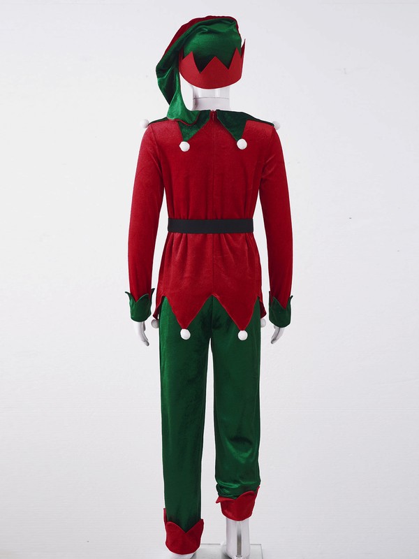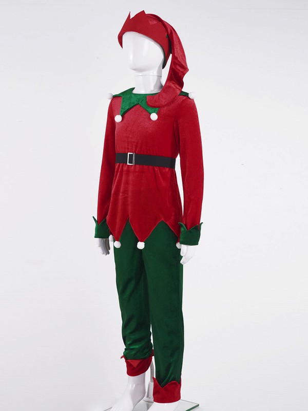 Kids Unisex Christmas Elk Elf Cosplay Costume Velvet Tops with Pants Belt and Hat Set.