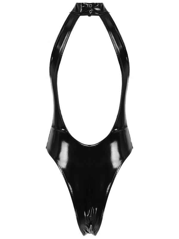 - Women’s one piece patent leather leotard bodysuit.