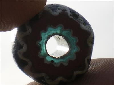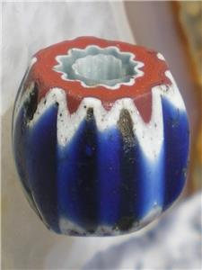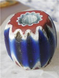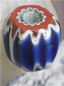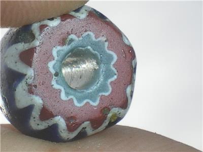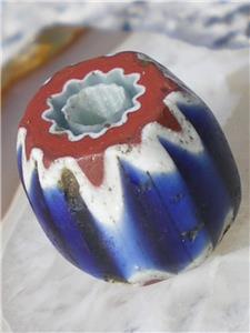 The chevron or star bead is from the familly of drawn beads, called "rosetta" in italian. They habe been made in italy since at least 1496. They were made using a fifteen step process. When it is viewed in cross section, a star pattern is visible. In West Africa, they are called "King beads" because they were used by only by the chiefs of tribes. Most are 4 or 6 layer, although they can be up to 10 layers. The second, 4th and 6th layers are always white.