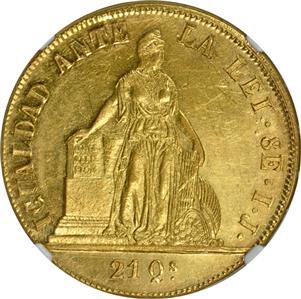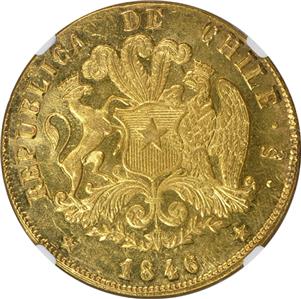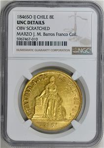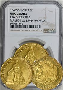 Chile Republic 1846 SO IJ 8 Escudos graded by NGC as UNC DTLS due to small obverse scratches.