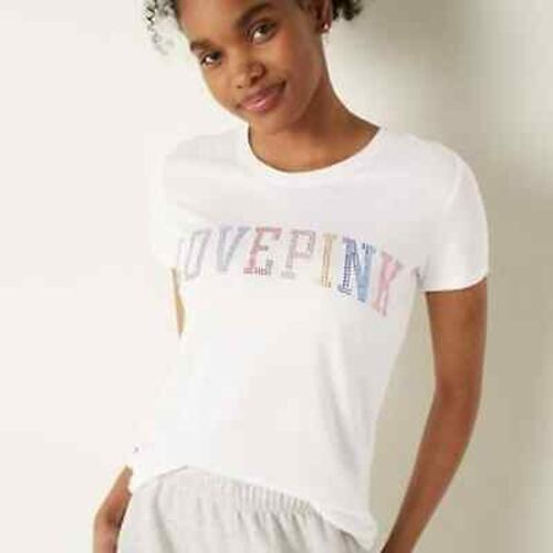 Victoria's Secret PINK Womens Rainbow Logo Bling T-Shirt White LARGE NWT