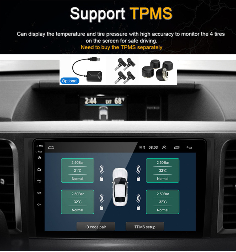 Additional | - Textbook: Could change font, font color, background color, bookmark, reading E-book while listening music - Photo Viewer: Support JPS, BMP, PNG, GIF etc. format. play by revolve, Powerpoint Support 4096*4096 Pixels - Wallpapers: 5 live wallpapers, 17 standard wallpapers, support DIY wallpaper from Gallery - APK Installer: Support Android Package installer - Support Torque Pro(OBD2 &Car): Yes, you can connect a Bluetooth OBD2 Scanner Tool to use this function - Support Mirror Link function: Yes, support screen mirroring from iPhone and android smartphone - Support TPMS: YES (Not Included, you can us to buy it together) |