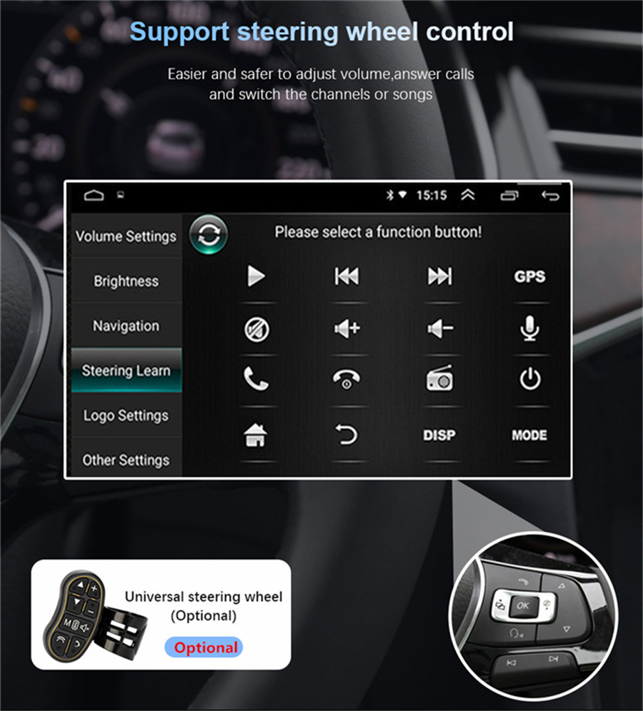 Setup | - WiFi/Hotspot/Bluetooth: Yes - Brightness level adjustable: Yes - Wallpaper: Wallpapers/Live Wallpapers/Gallery - Sound: Key Tone & Volume - Storage: Display Internal Storage/Nand Flash/Connected Device Storage - Apps: Running Apps display/force stop/uninstall - Security: Yes - Accounts: Yes - Languages and Input: more than 70 Languages and choose input method - Backup and Reset: Yes - Date and Time: Setting Date&Time by yourself or choose GPS/network-provided time - Accessibility: Yes - GPS: Yes, GPS application options/monitoring/sound mode/mixing ratio - Driving safety: Watching Video, Reversing X-mirror/Volume, Reversing Trajectory/radar Display, Rear view ruler - Amplifier: Rock/Pop/Jazz/Classic/Flat/Voice/Custom - Steering Wheel Control: Yes - About Device: Display Parameter Info. |