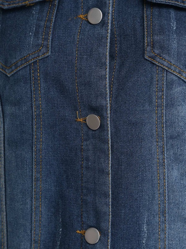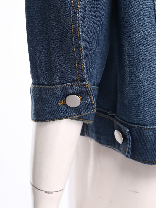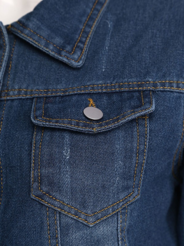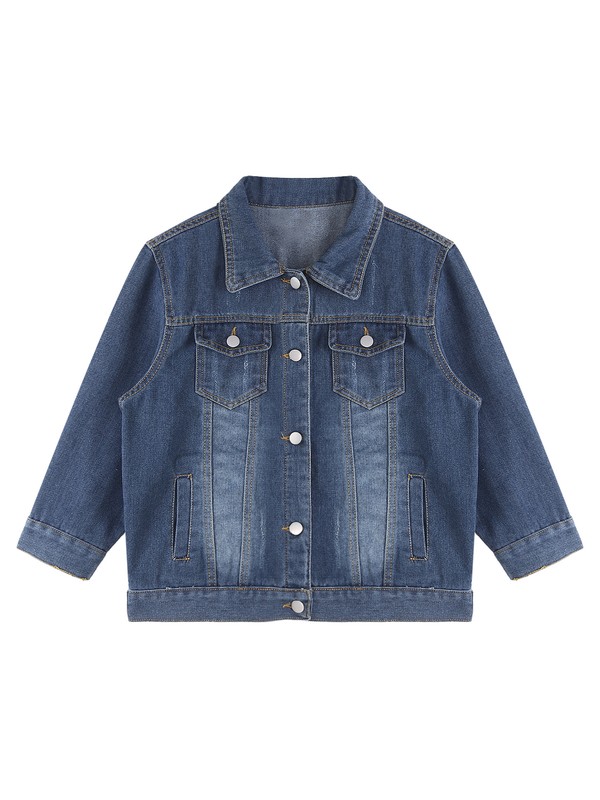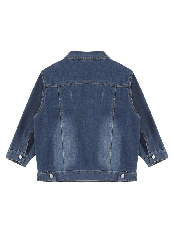 Casual denim jacket features 3/4 sleeve, turn-down collar, button closure, regular fit.
