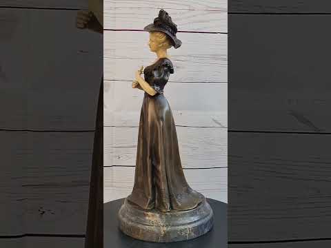 This impeccably detailed sculpture portrays a fashionably attired young lady exuding an air of sophistication and elegance. Every aspect of her attire, from the intricate feathers adorning her hat to the delicate fan she holds, speaks to her refined taste and status. Her poised demeanor suggests a woman of means, accustomed to the finer things in life and confident in her own grace and style.