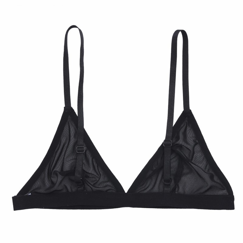 Women’s sheer mesh bralette, unlined triangle cup, stretchy fabric.