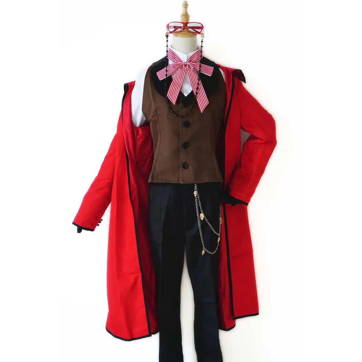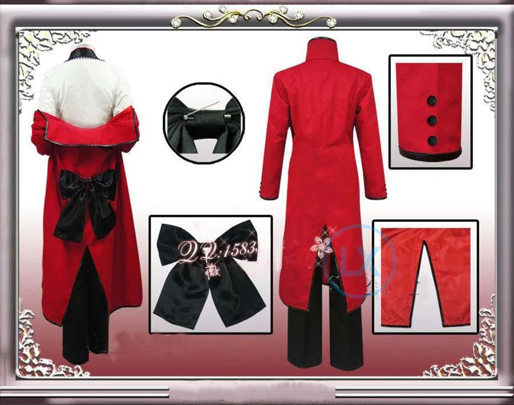 2.Full Set includes: red windbreaker + shirt + vest + pants + sleeve loops + gloves + bow tie + black bow on the back + glasses + pants chain