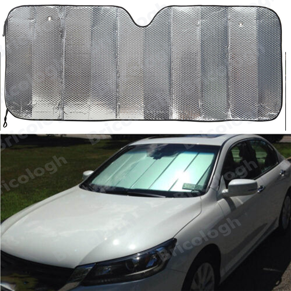 Item Description • Silver color fordable sun shade, during the hot sun's day, hold up a shade for your car. - Let your car with hot sunshine isolation, anti-UV protection and reduce direct sunlight caused aging interior. - If in a very hot season, put aluminum foil out to ensure that the reflected sunlight. • Prevents inside of car from heating up, keep cool. • Windscreen sun shade fits most windows. • Easy to install and remove, fordable . • Secures with sun visors.