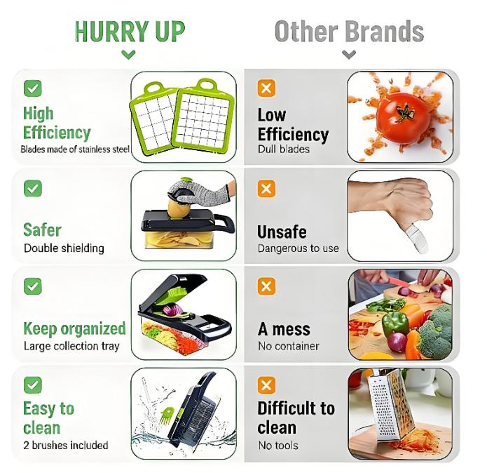 This vegetable cutter offers a 1.5 liter container to hold fruit or vegetables. The non-slip silicone on the underside offers a high level of stability on the work surface. We also provide cleaning claws and brushes, the peeler helps peel the skin better in vegetable slicers.