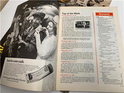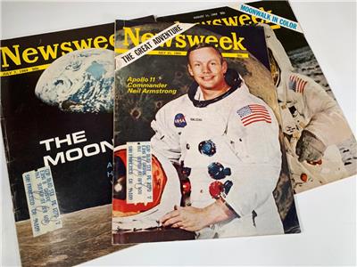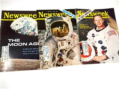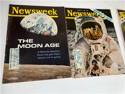 Lot of 3 vintage newsweek magazines from 1969. Good previously read condition; solid binding, no loose pages; limited edge creases; small water stain on edge.